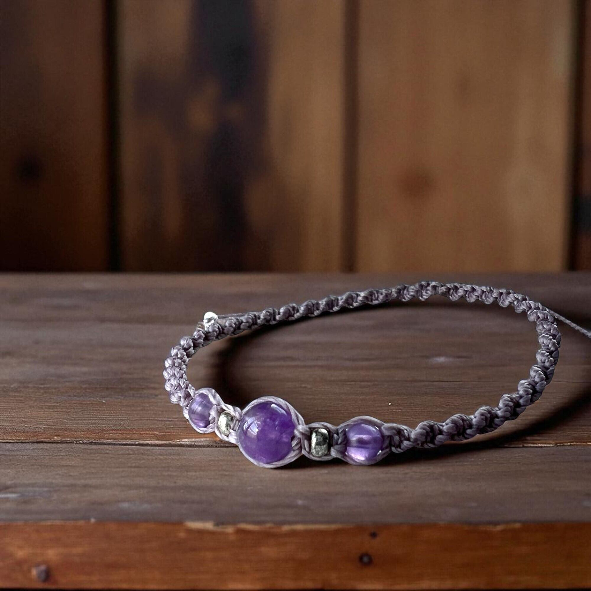 深みのある紫が美しい天然石「アメジスト」を、落ち着いた色合いのワックスコードで丁寧に編み上げたシンプルなねじり編みブレスレットです。