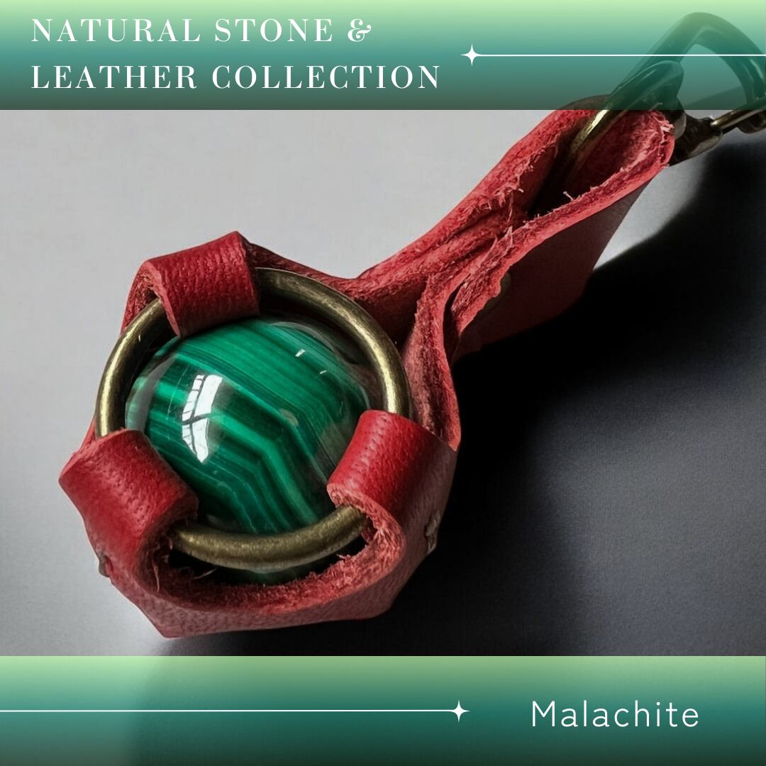 深いグリーンの天然石「マラカイト」を、アンティーク調の金具と手縫いの本革で丁寧に包み込んだ、特別感のあるキーホルダーです。