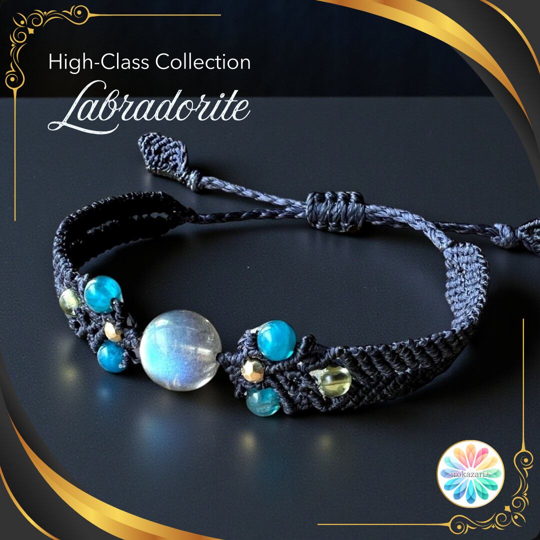 見る角度で青く輝くラブラドライトを主役に、ブルーアパタイトとペリドットを添えて編み上げたマクラメブレスレットです。