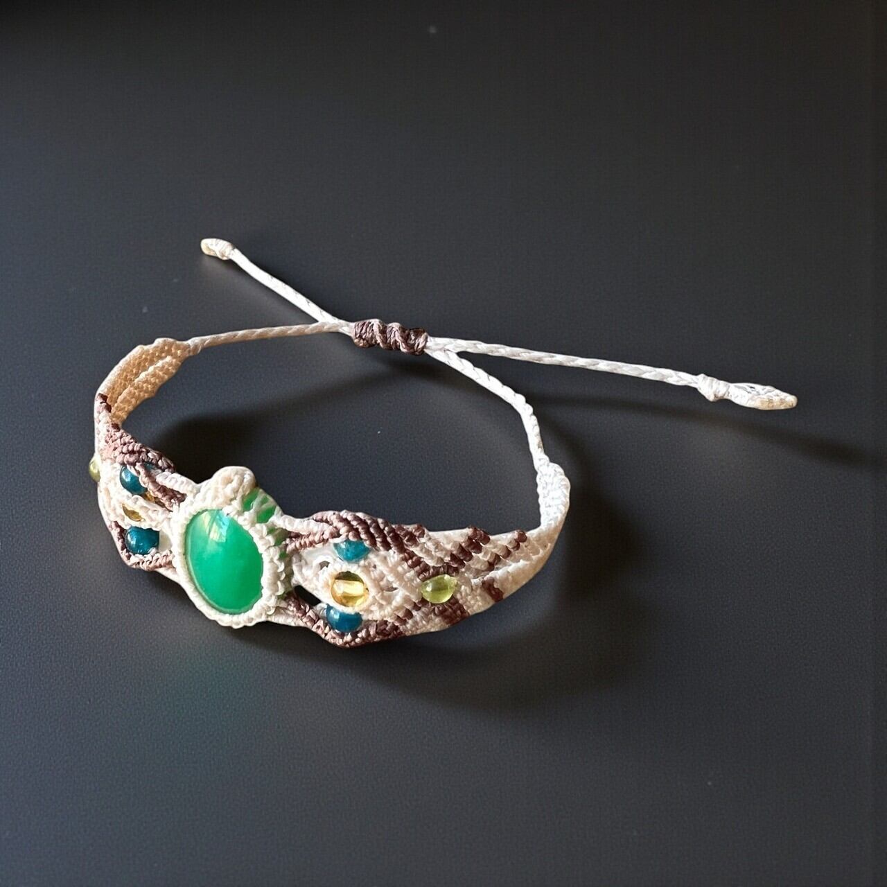 ベージュとブラウンの紐を丁寧に編み込んだマクラメ仕上げは、軽さと安定感のバランスがよく、手首になじみやすい仕様。