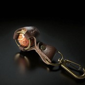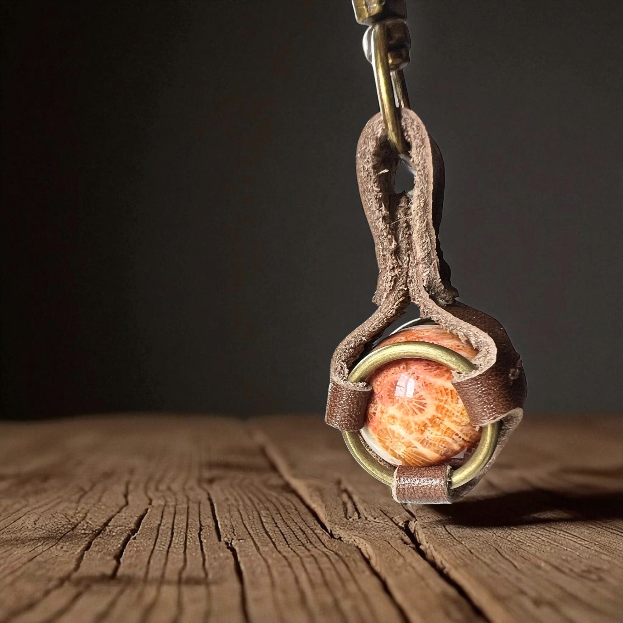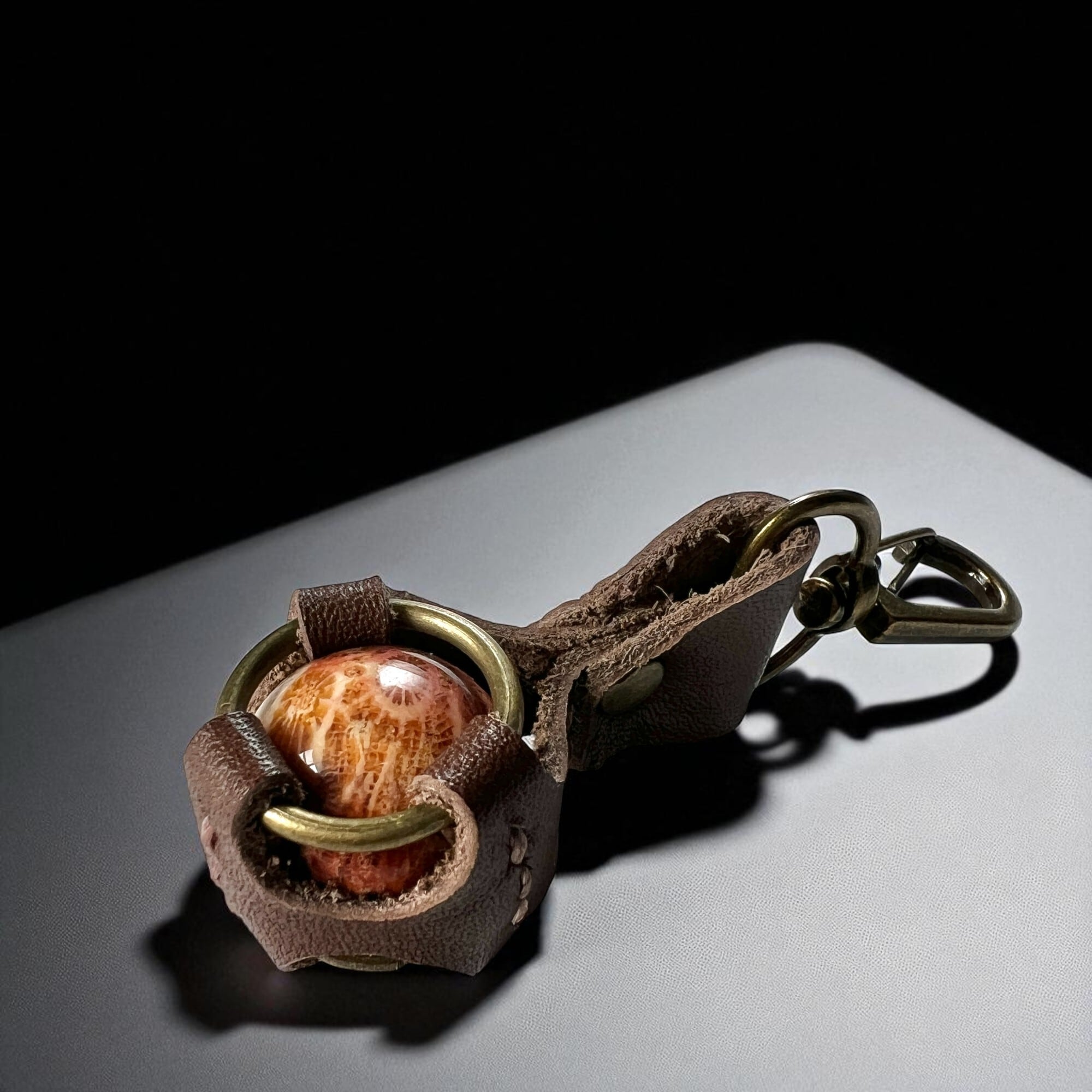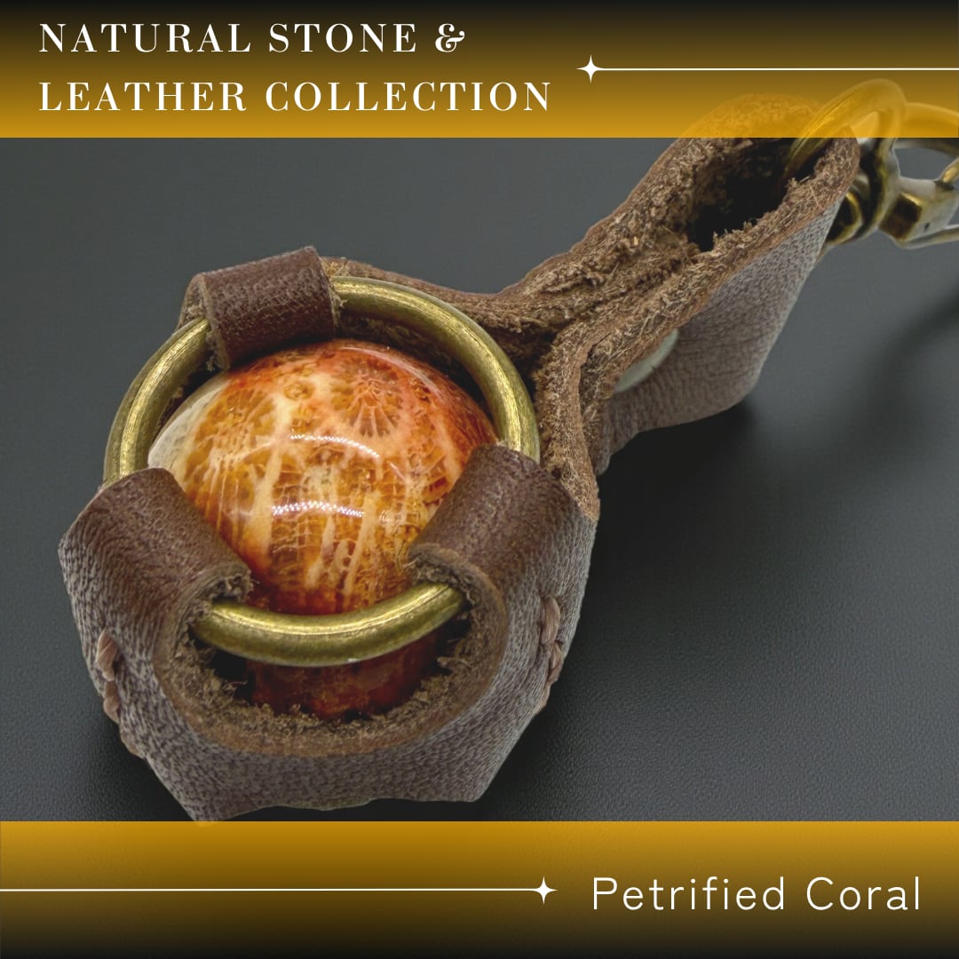 数千万年前のサンゴが化石化して生まれた天然石「ペトリファイドコーラル」を、本革レザーで包み込んだキーホルダーです。
