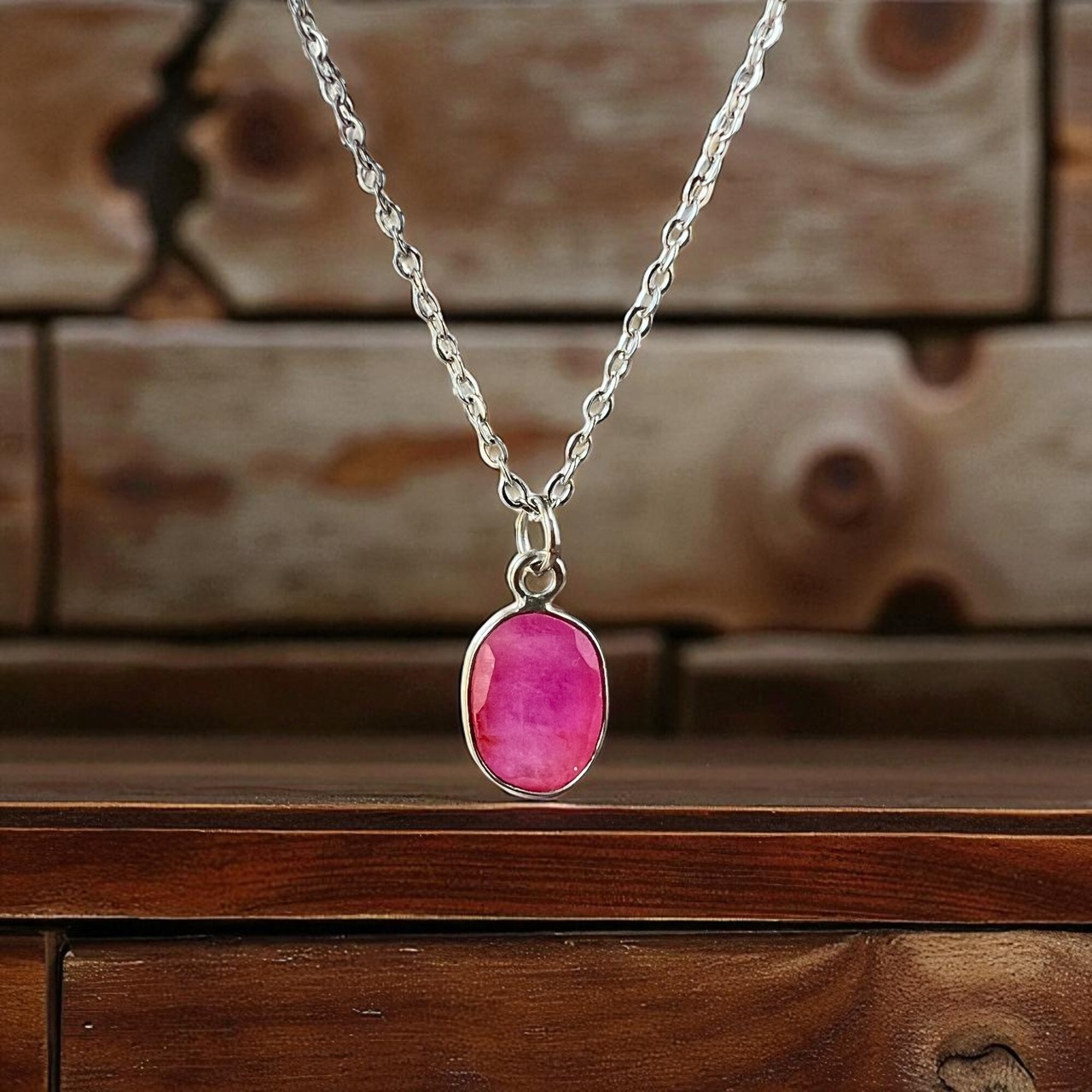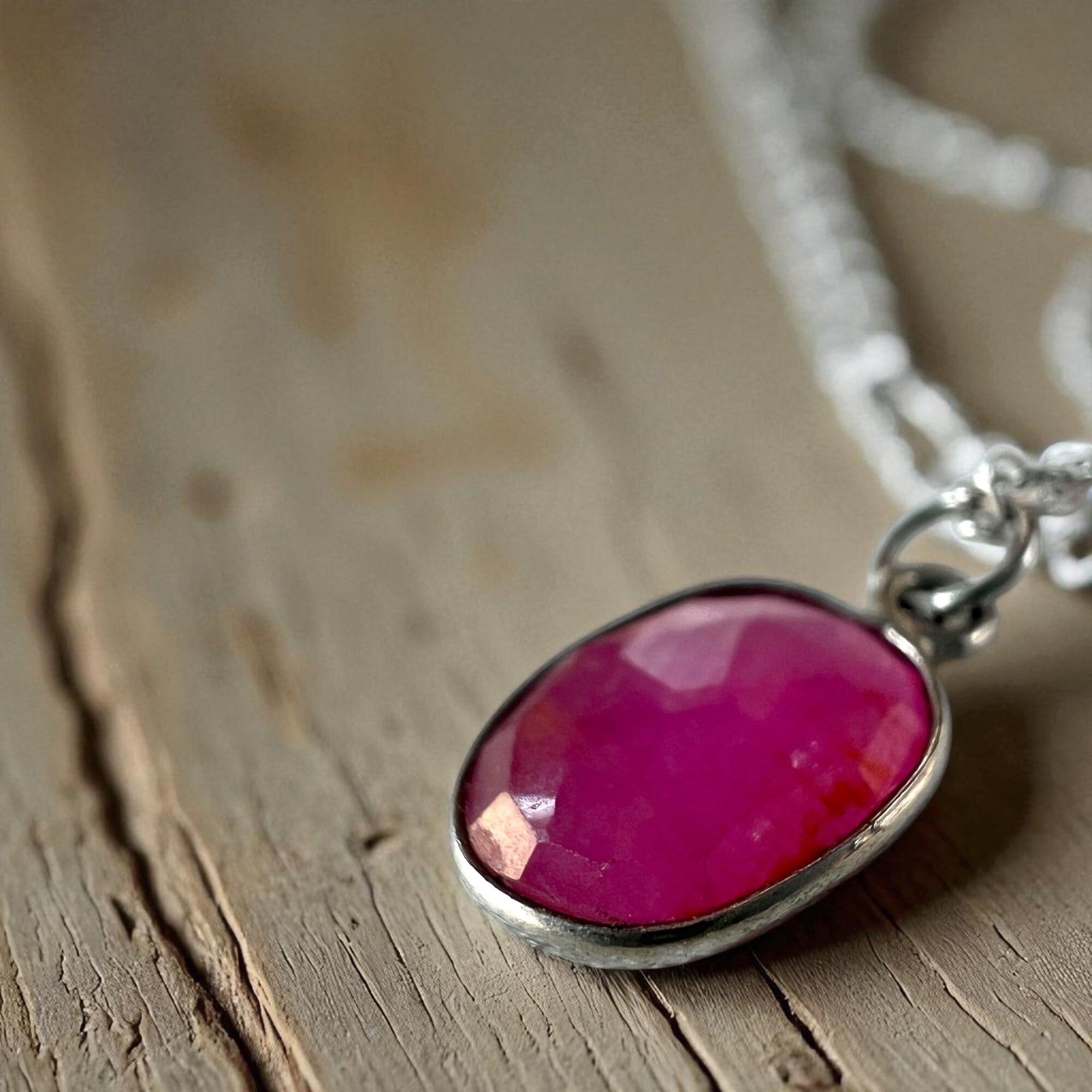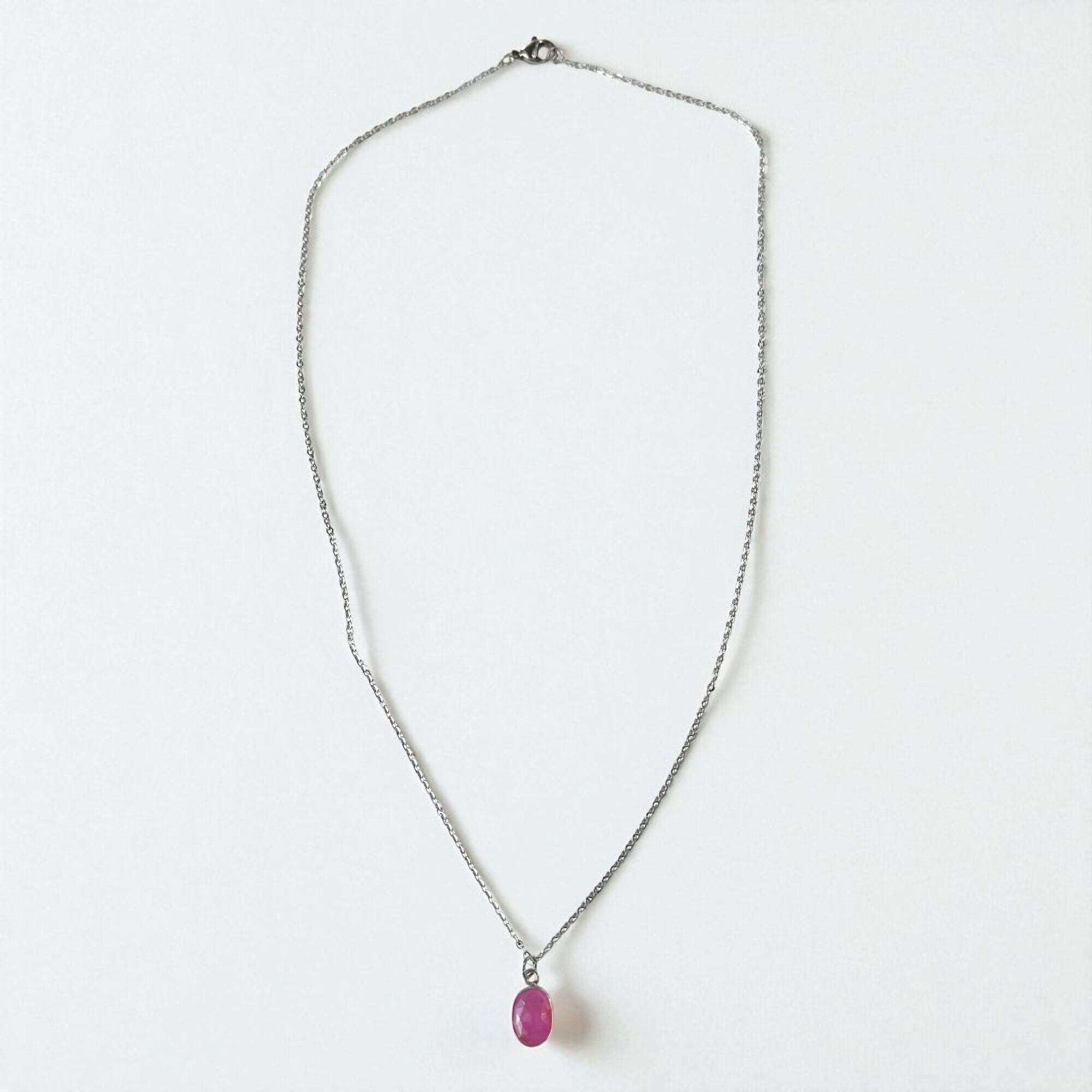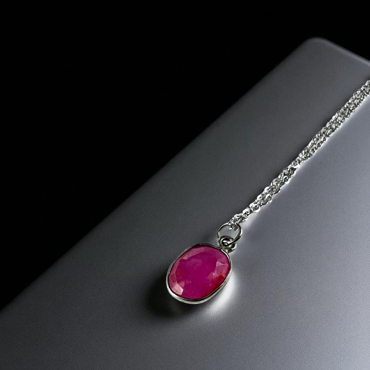 鮮やかな深紅が目を引く、非加熱ルビーを使った一点物のネックレスです。ルビー本来の色合いを生かすために加熱処理を施さず、自然のままの美しさを閉じ込めました。