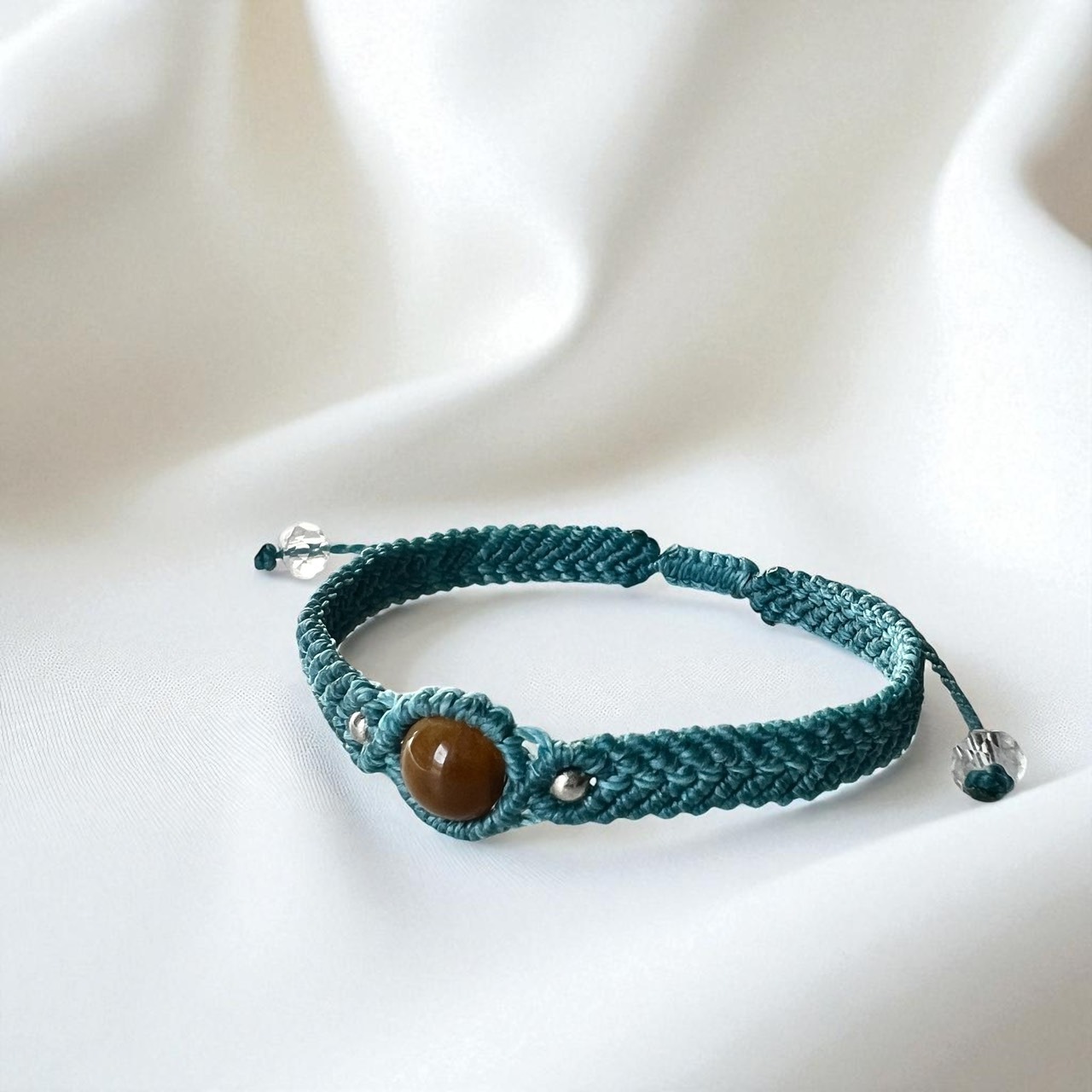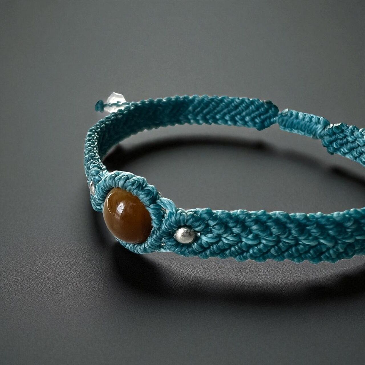 艶やかなブラウンのタイガーアイを、鮮やかなターコイズブルーのマクラメ編みで仕立てたブレスレットです。