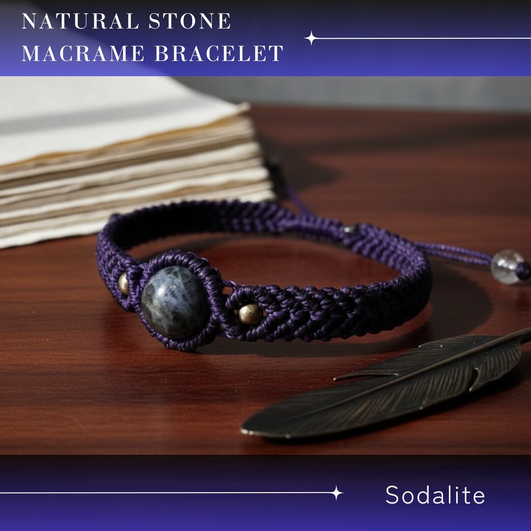 深い藍色に模様が浮かぶソーダライトを、バイオレットカラーのマクラメ編みで包み込んだブレスレットです。