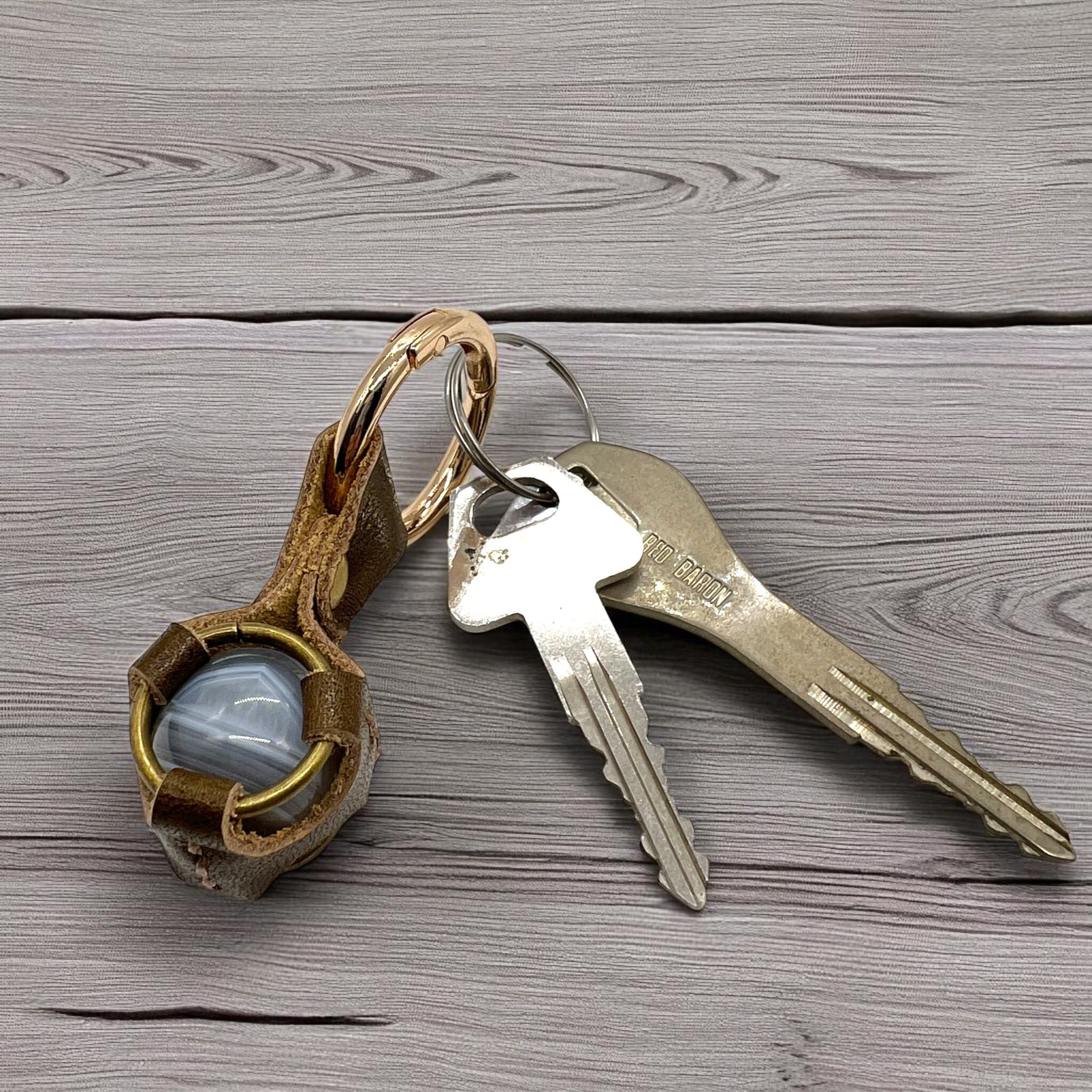 やわらかなグレーの縞模様が印象的なアゲート(縞瑪瑙)のキーホルダーです。