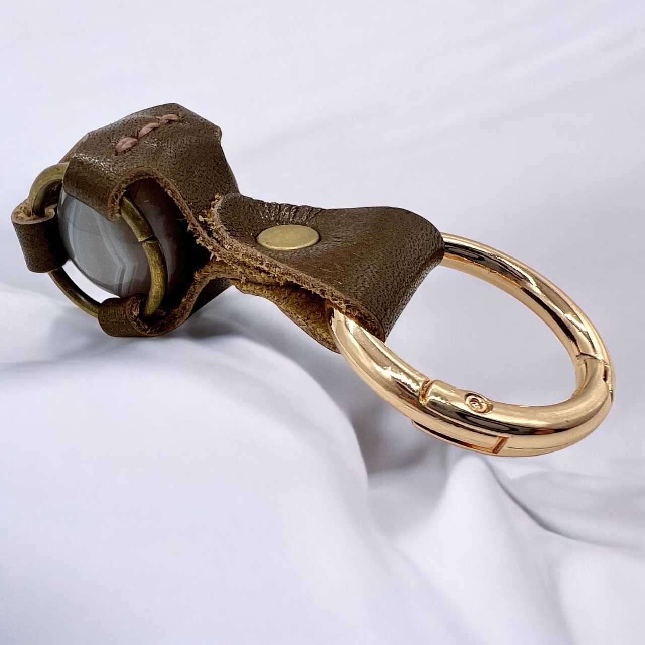 ブラウンの本革とアンティーク調の金具が、石の落ち着いた色合いを引き立てています。