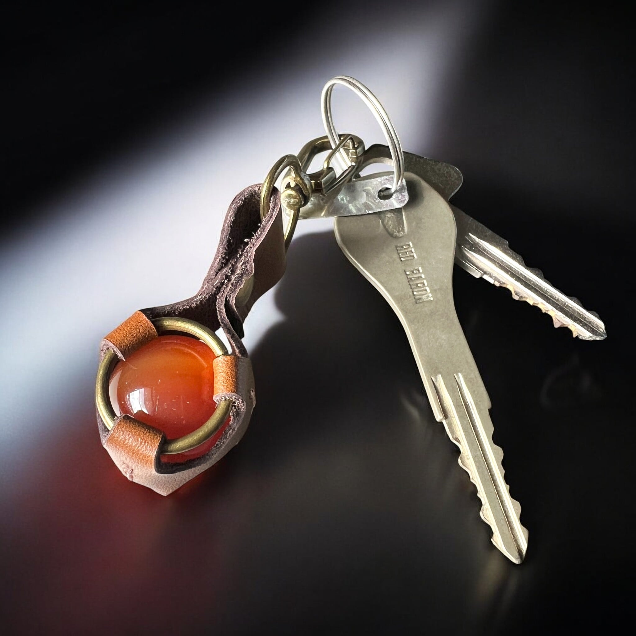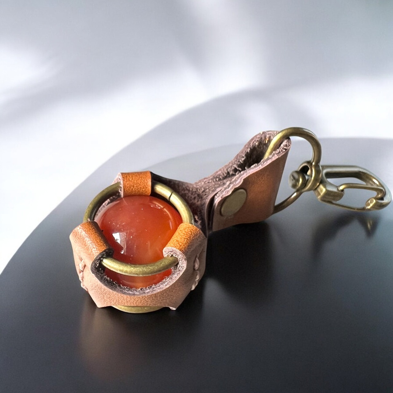 深みのある赤が美しい赤瑪瑙(レッドアゲート)を、本革で包み込んだキーホルダー。