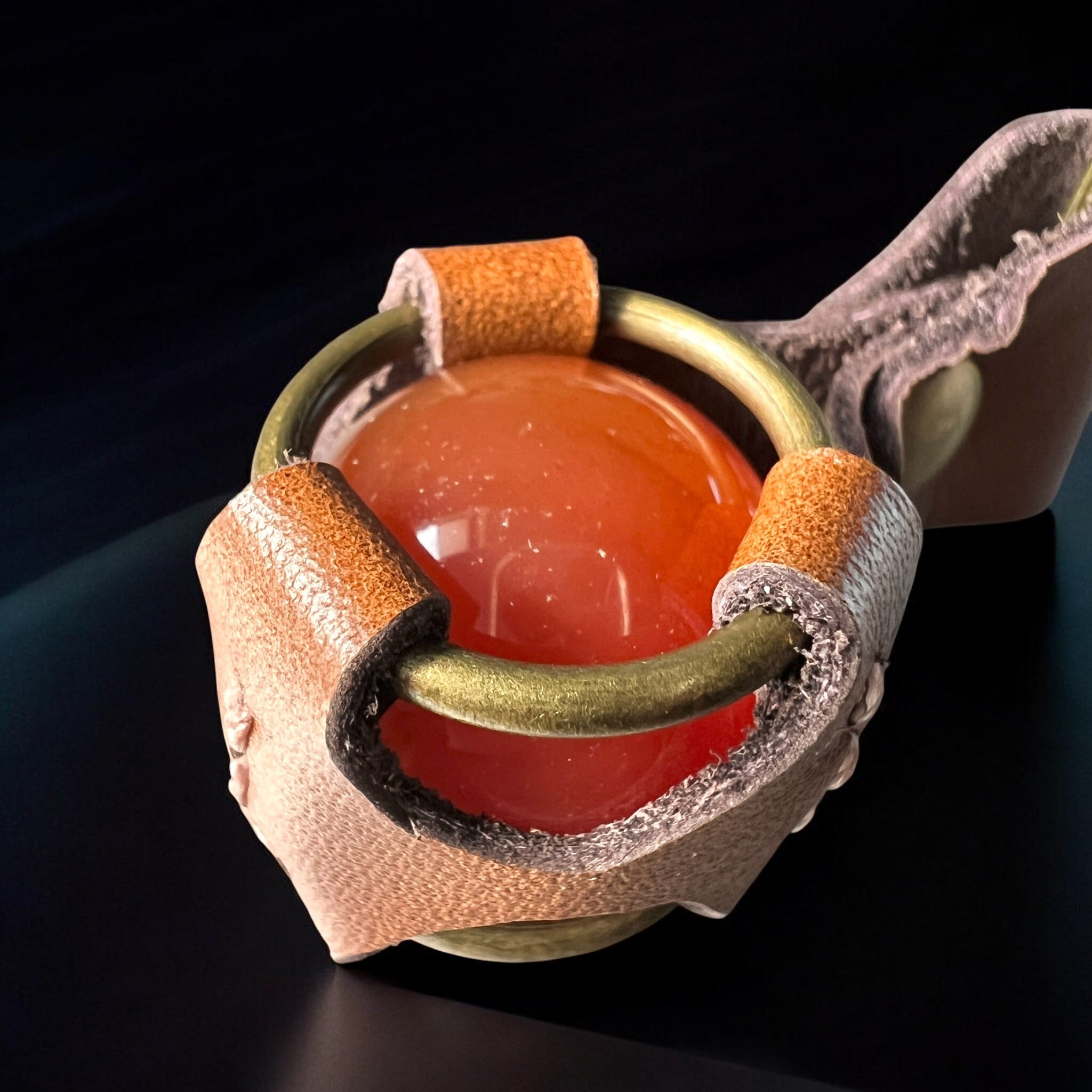 艶のあるブラウンレザーとアンティーク調の金具が、石の自然な温もりを引き立てています。