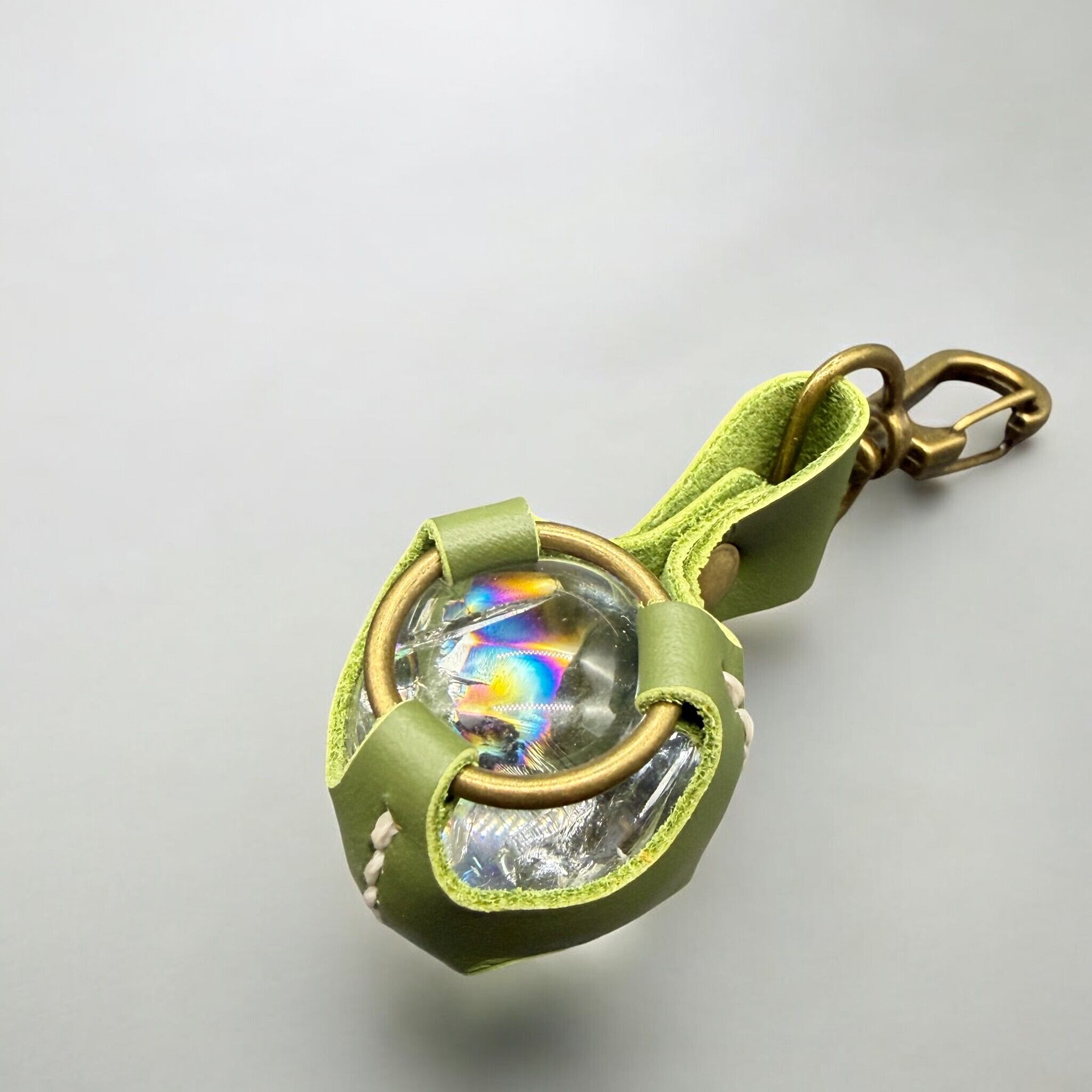 緑色のレザーで虹入り水晶を包み込んだキーホルダー。