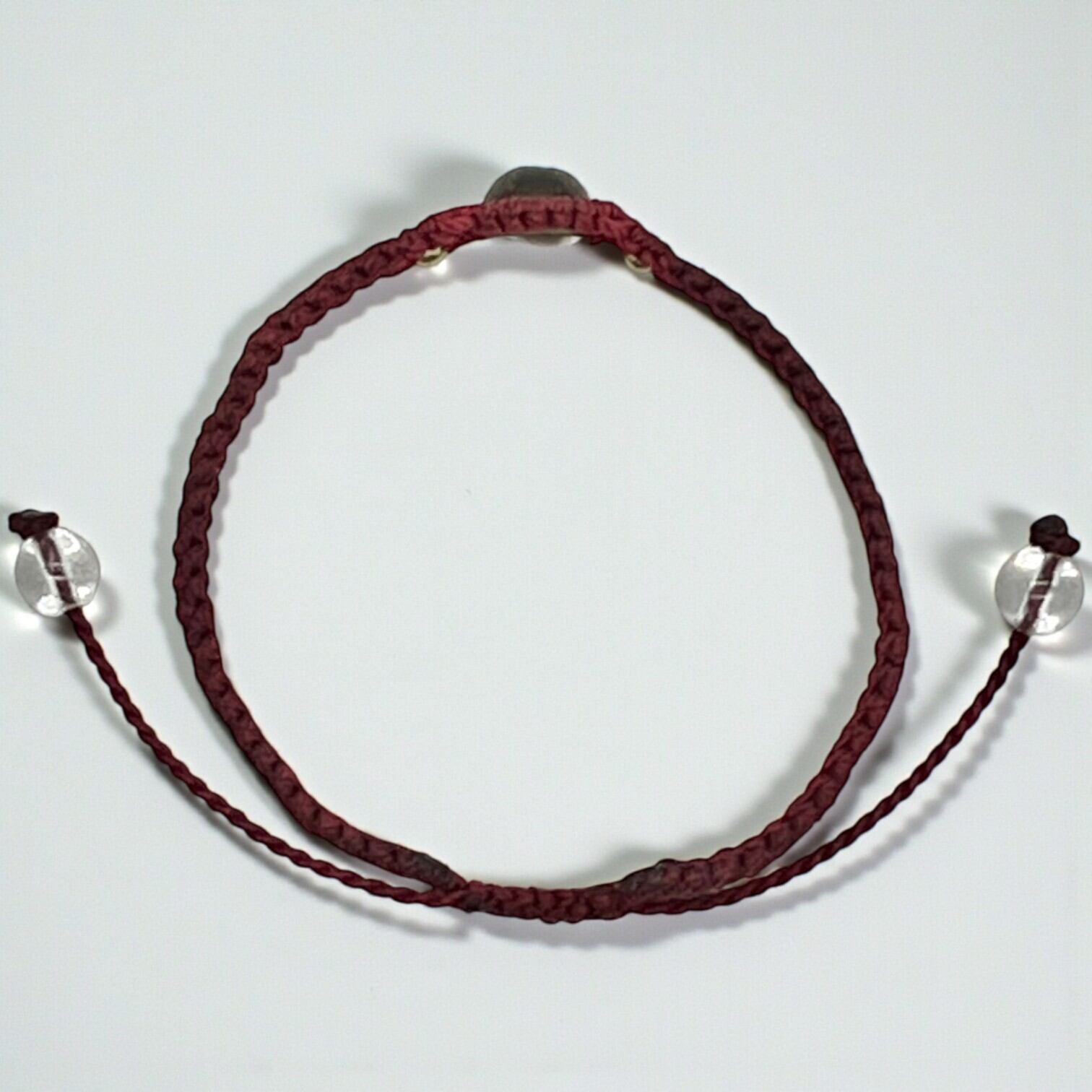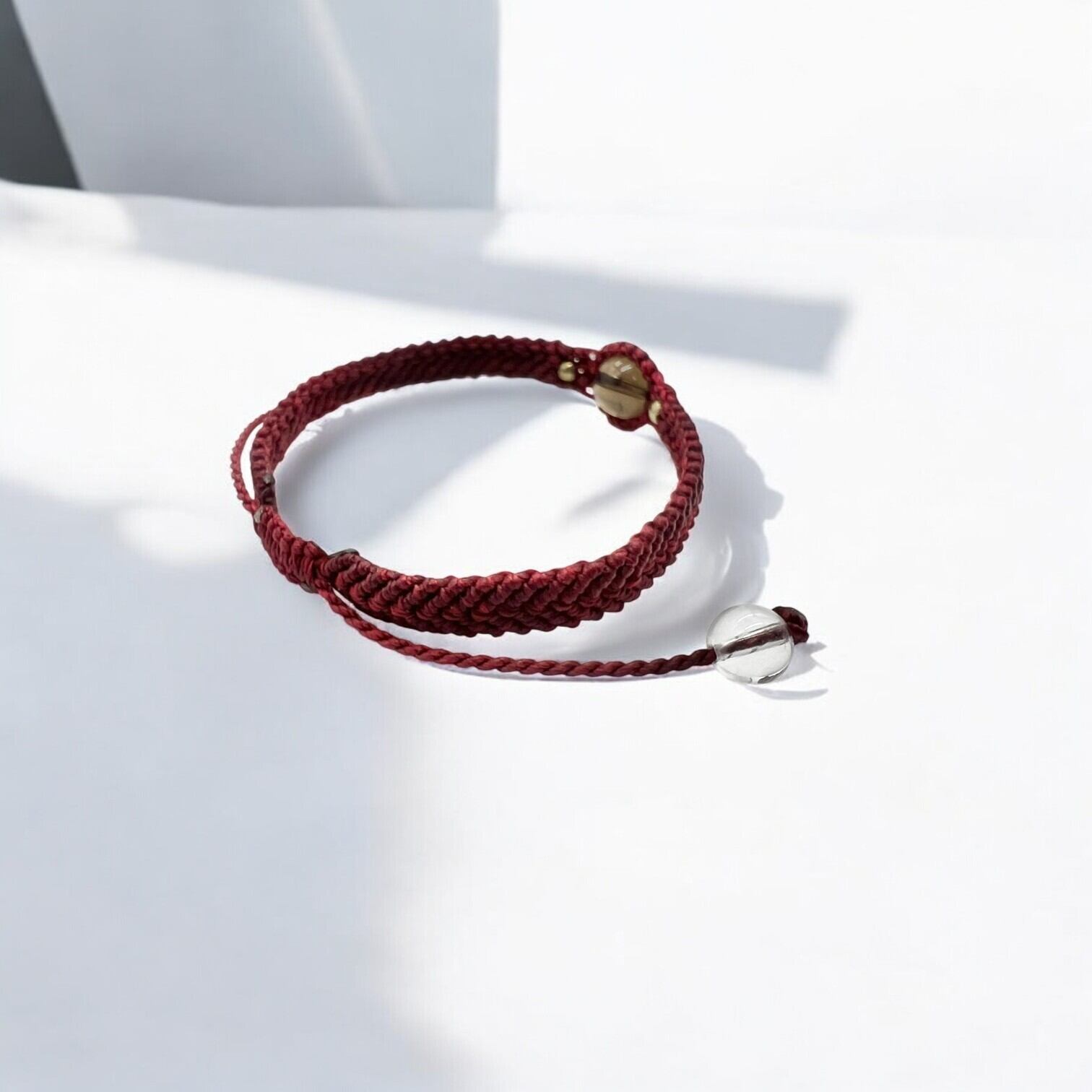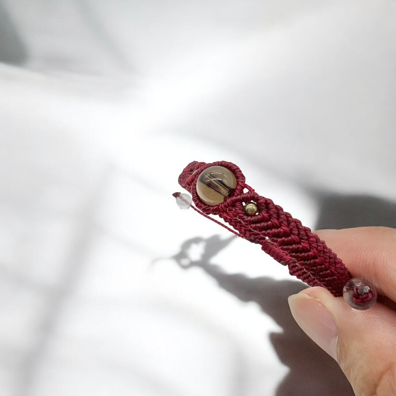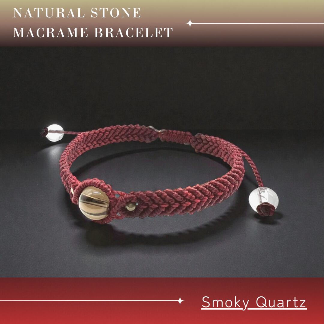 深紅の紐で丁寧に編み上げた、スモーキークォーツのマクラメブレスレット。