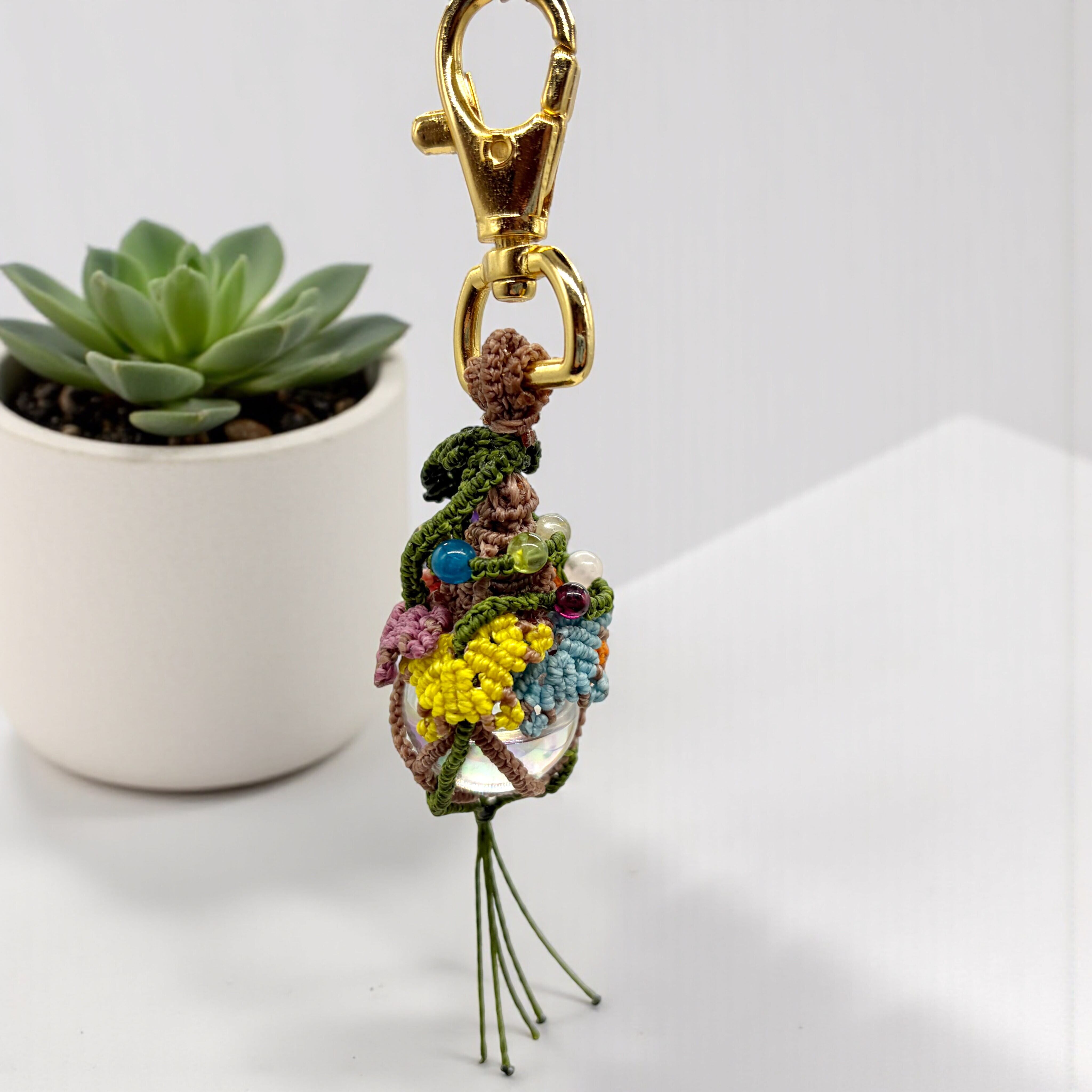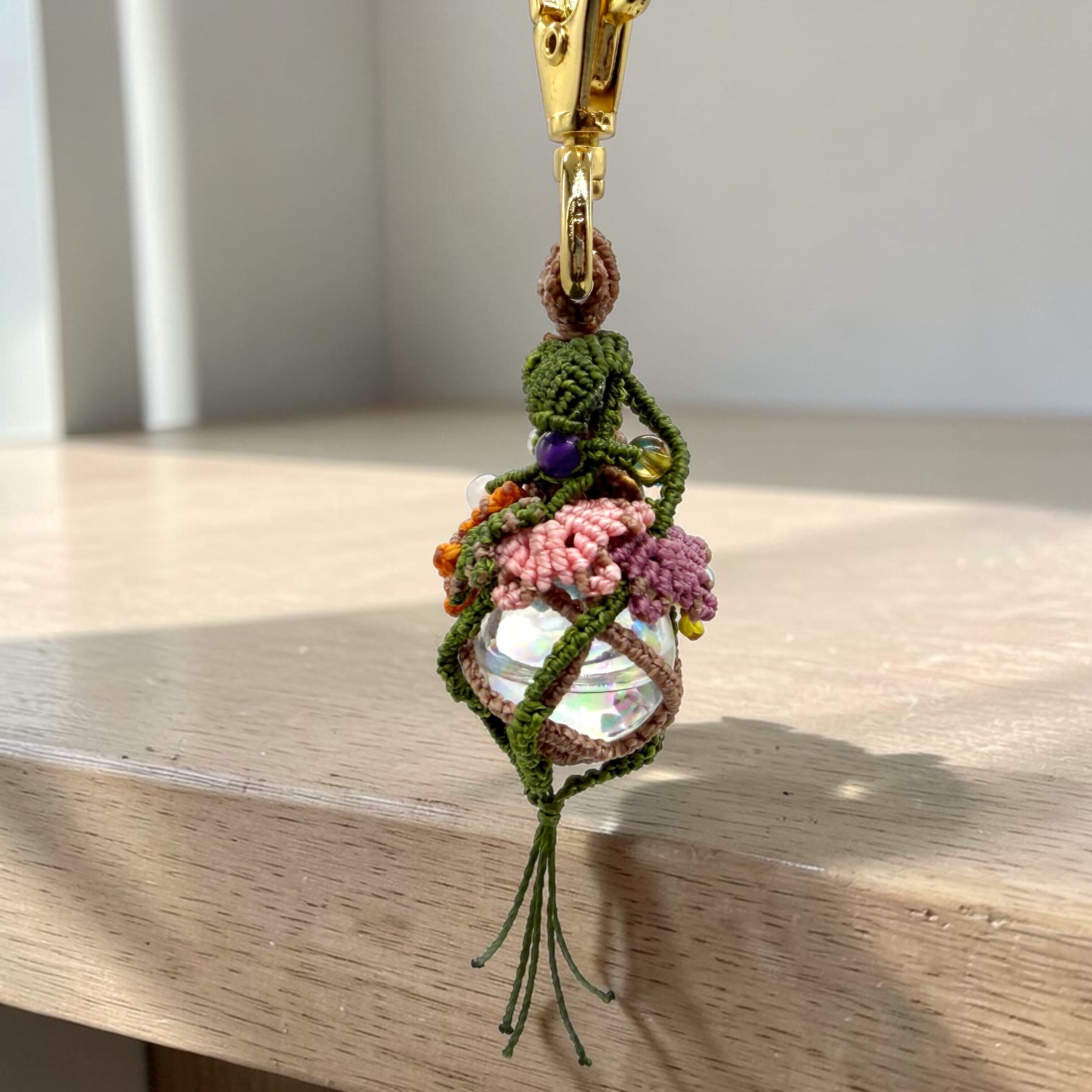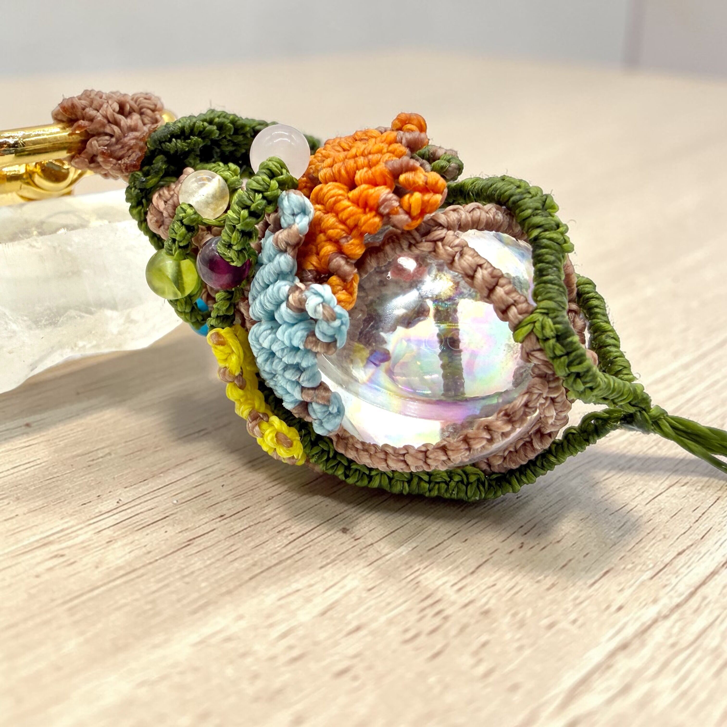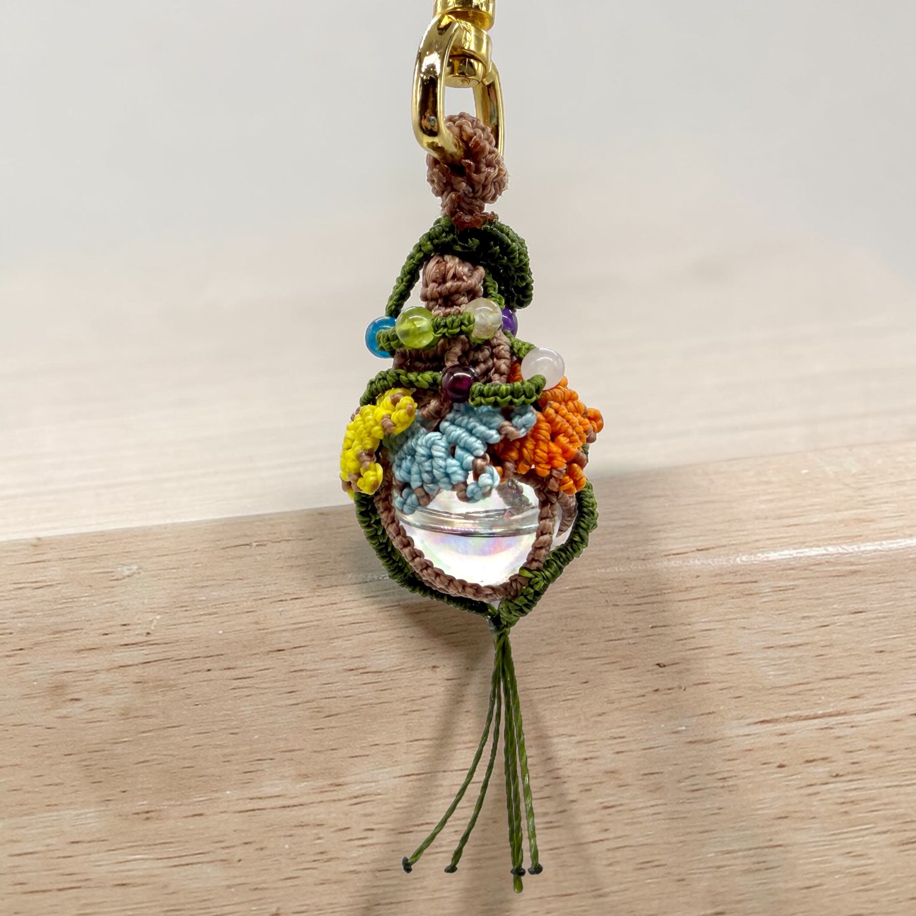 外側をマクラメ編みで包み込むことで、