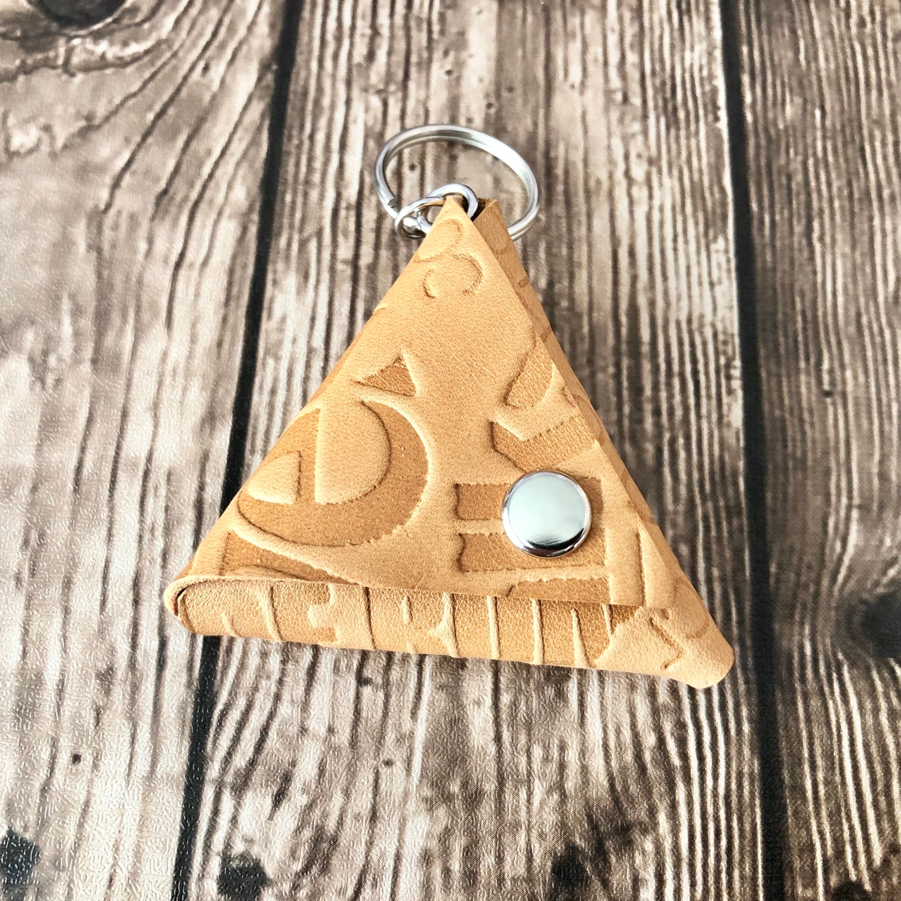 本革 三角コインケース ミニ キャメル 英字型押し キーホルダー付き レザー ハンドメイド【送料無料】[M-020KH]