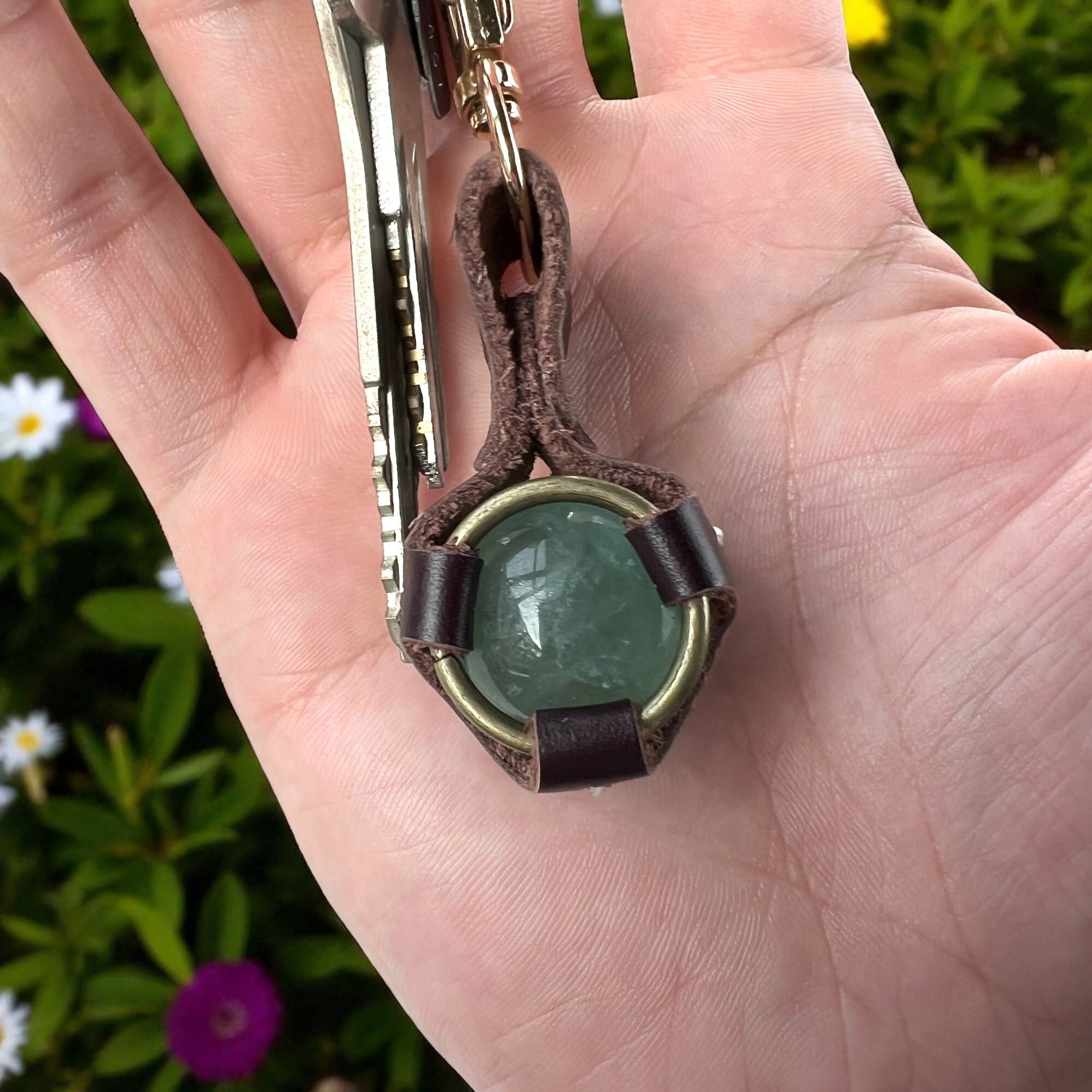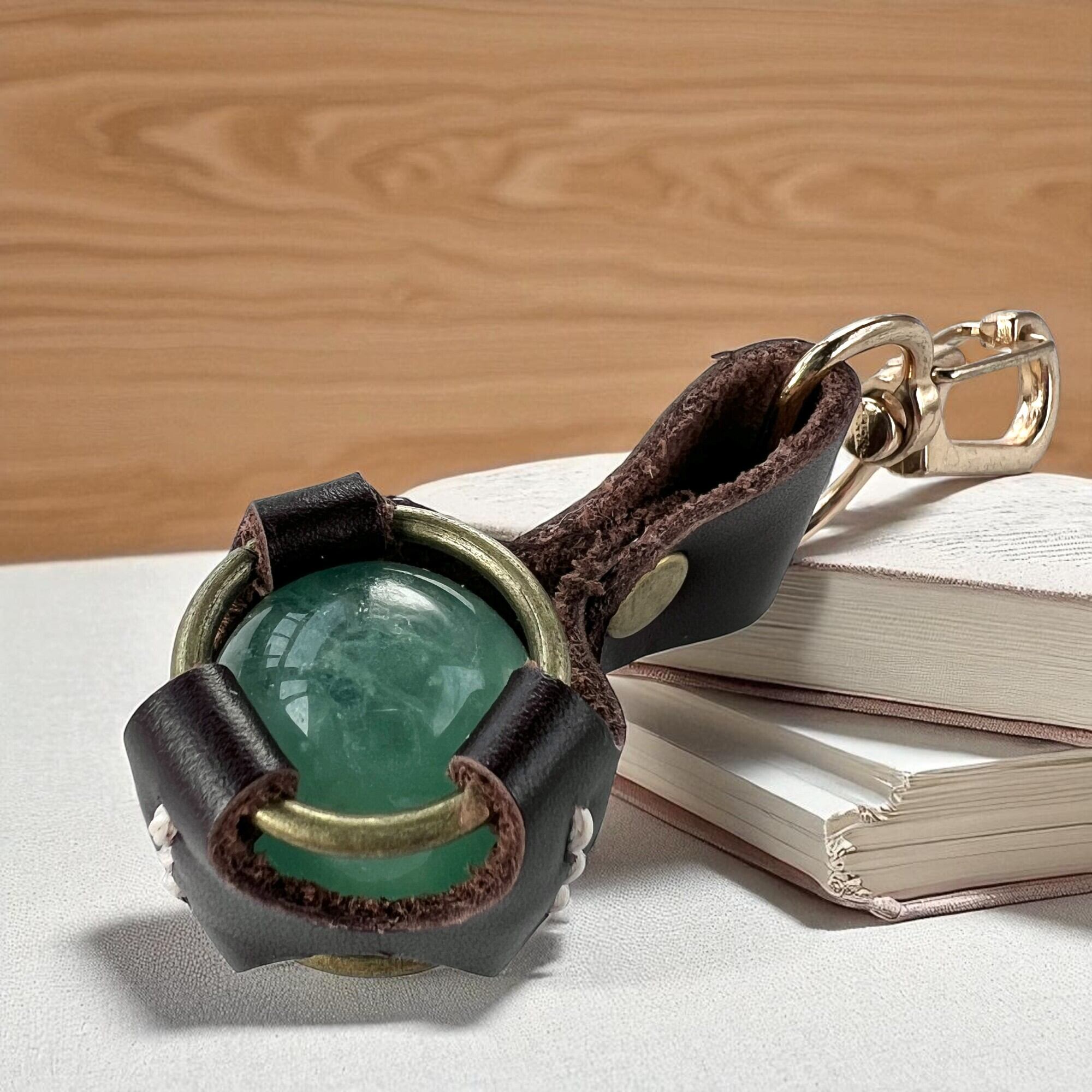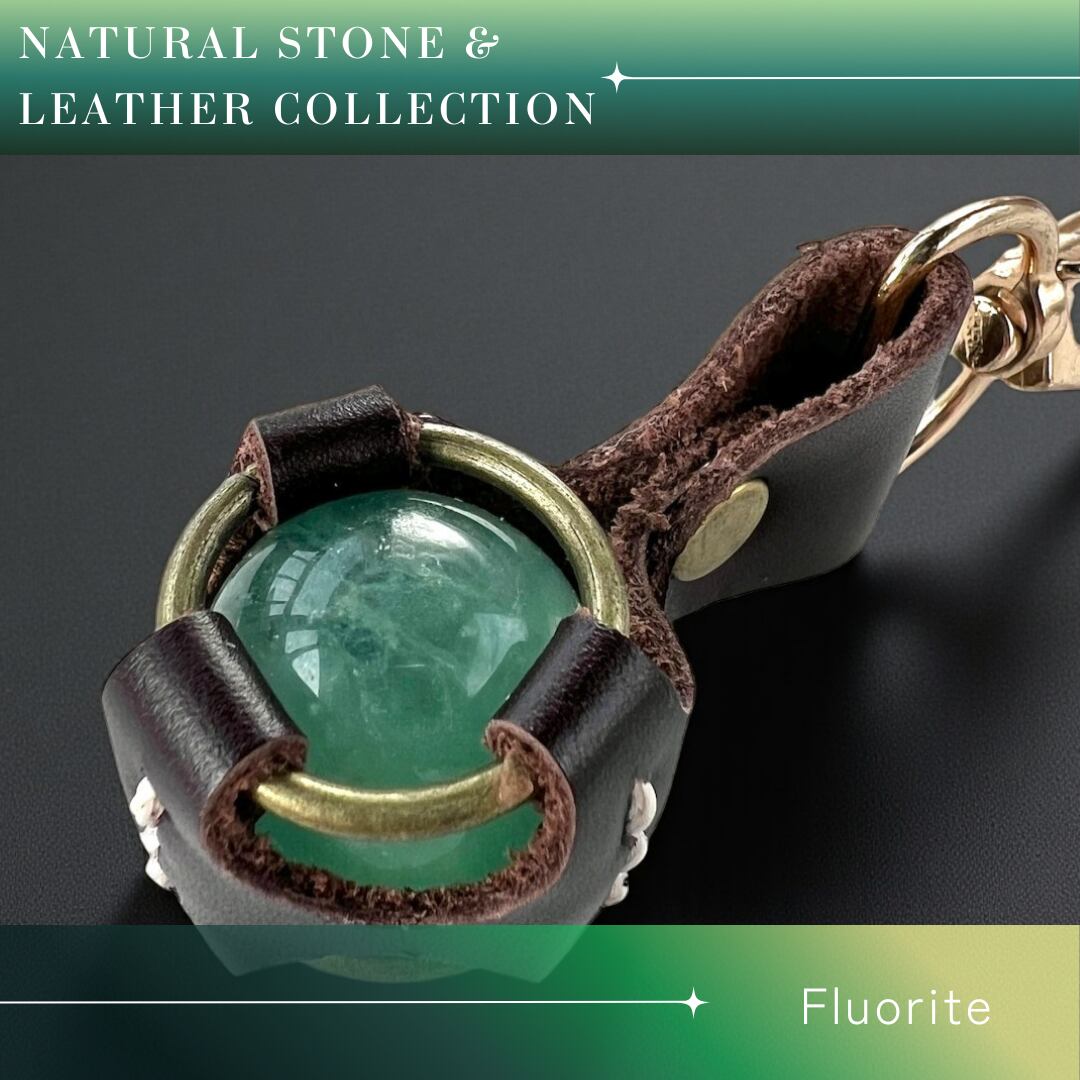 透明感のあるグリーンが心を静かに整える、天然石フローライトの本革キーホルダーです。