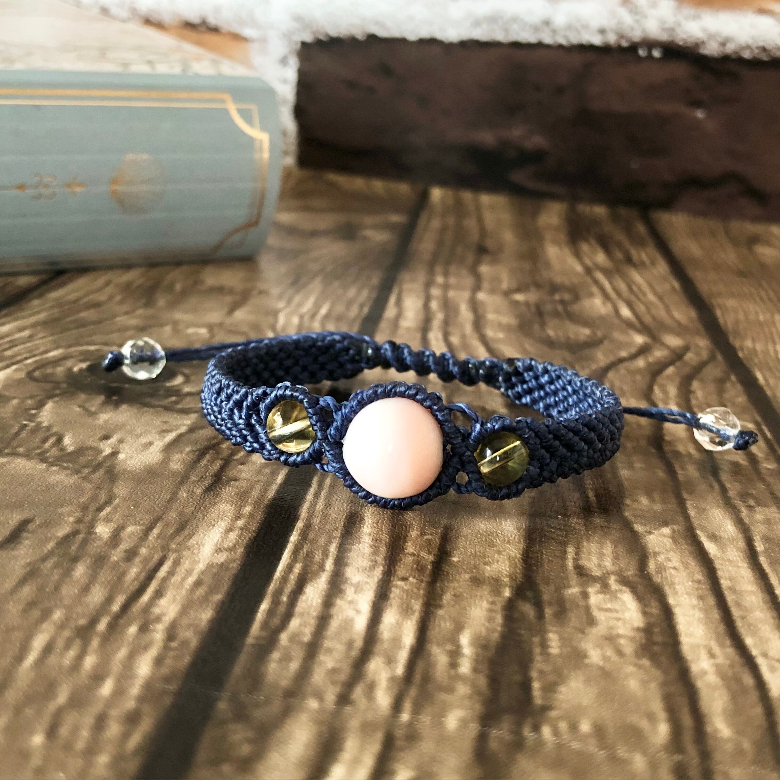 ピンクオパール、シトリン、水晶を使用した、ハンドメイドのマクラメ編みブレスレットです。