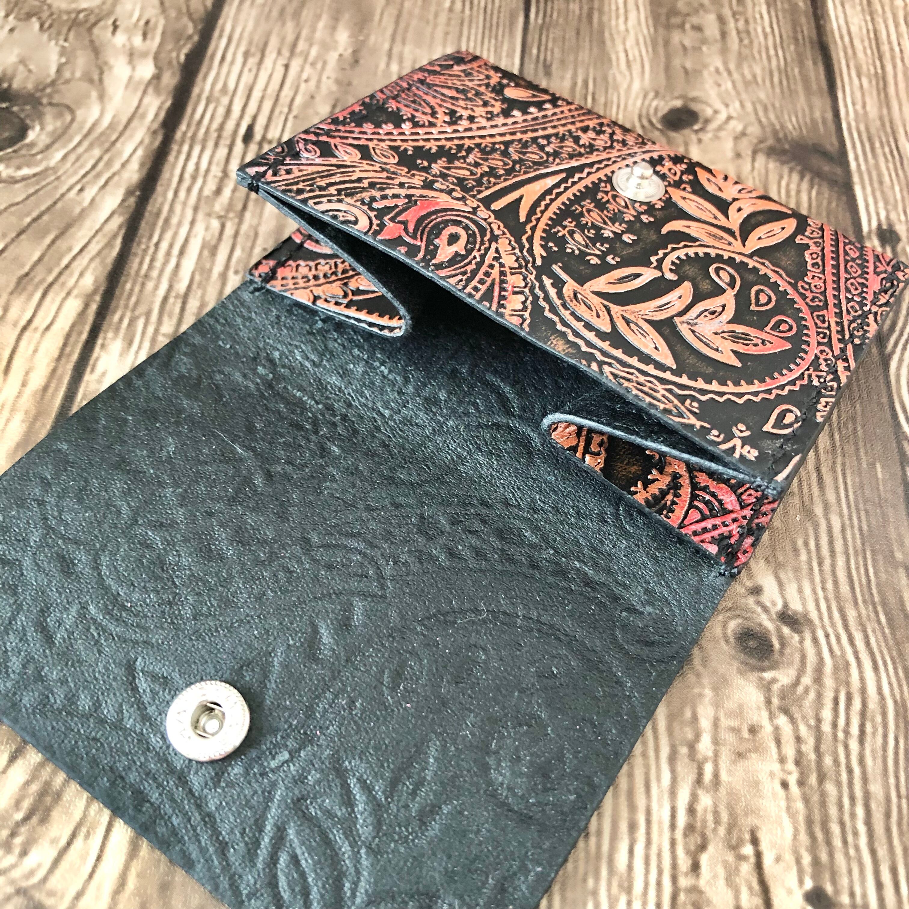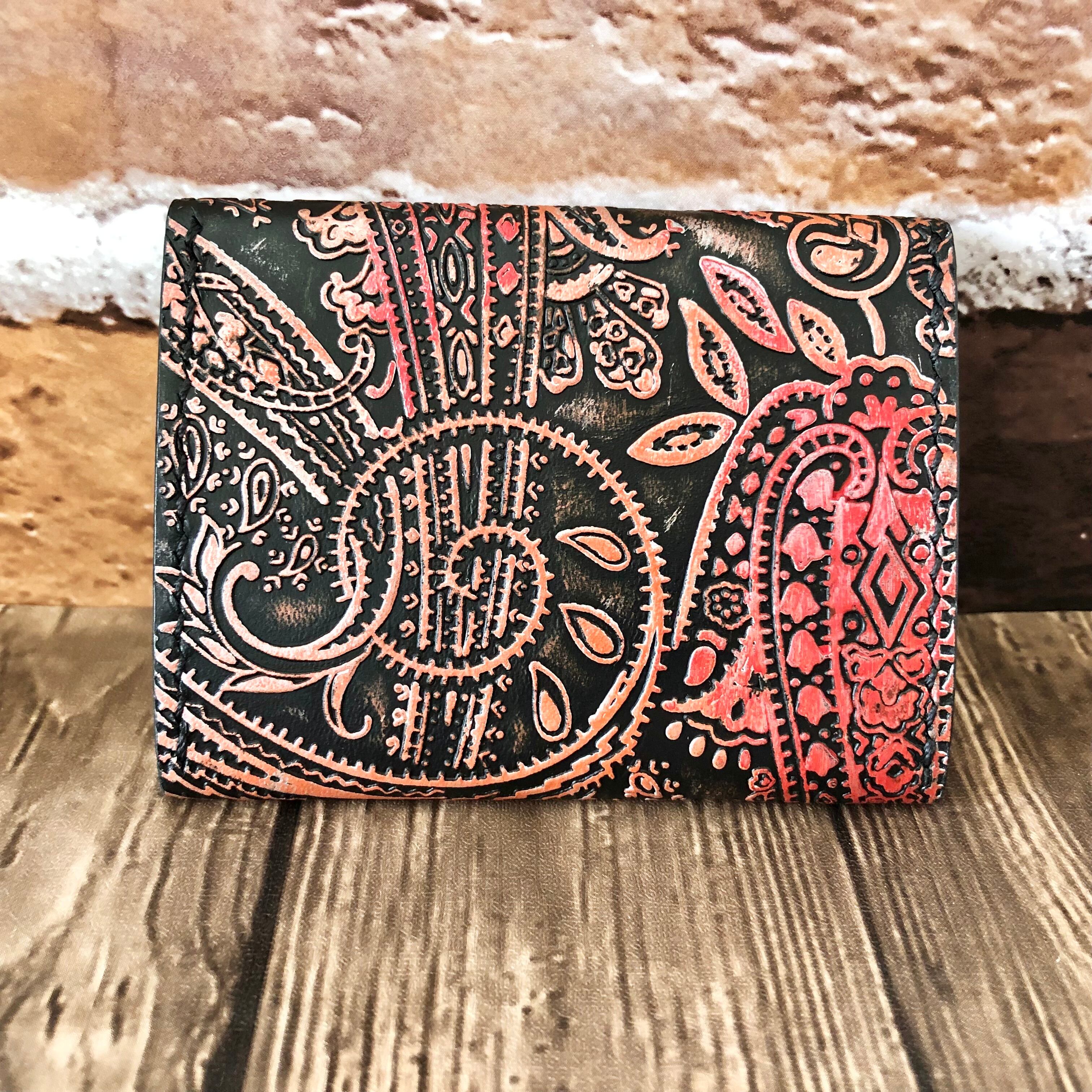 黒×朱のコントラストが美しい、ペイズリー柄の型押し本革を使ったコンパクトマルチケースです。