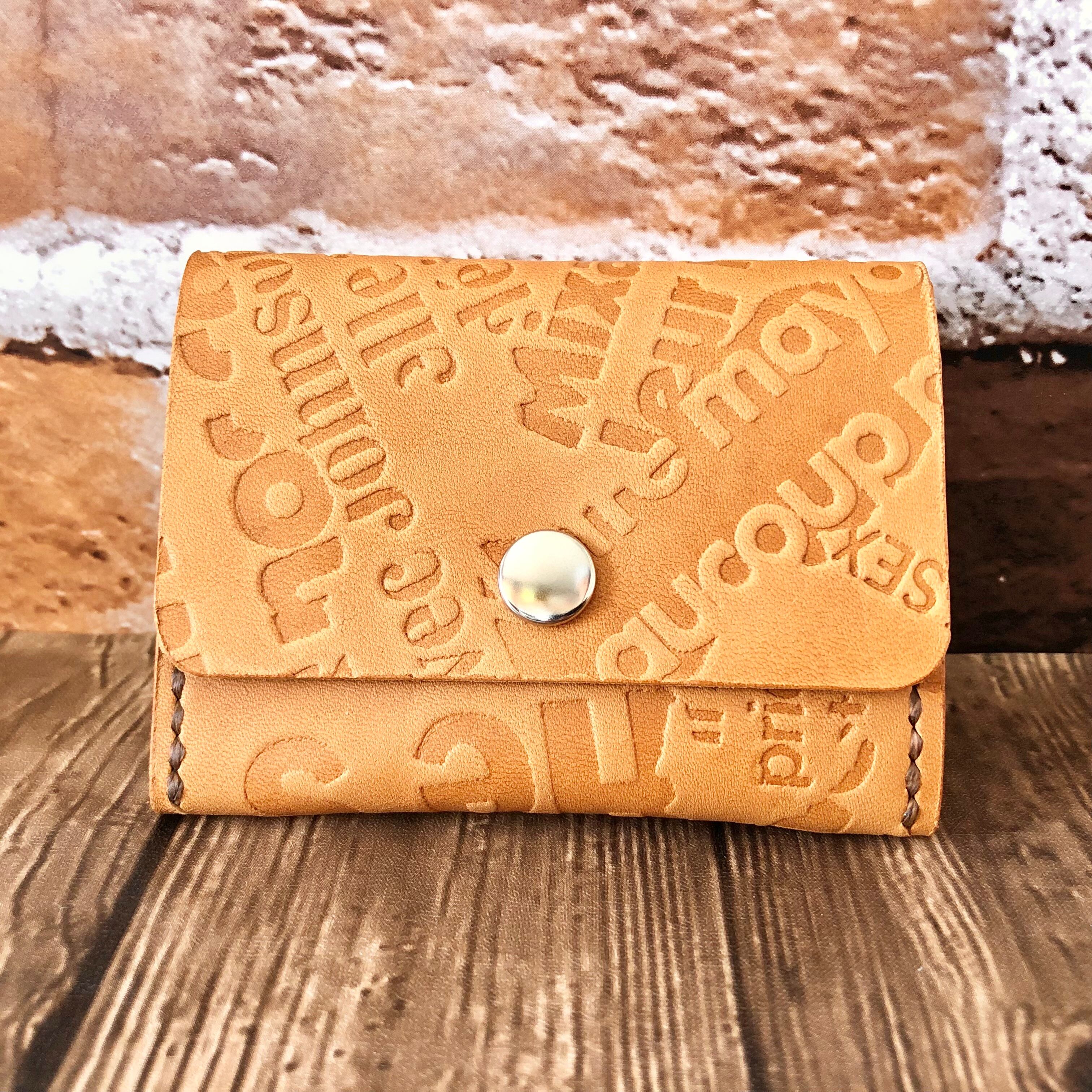 キャメルカラーの本革に英字柄の型押しを施した、コンパクトサイズのハンドメイドマルチケースです。