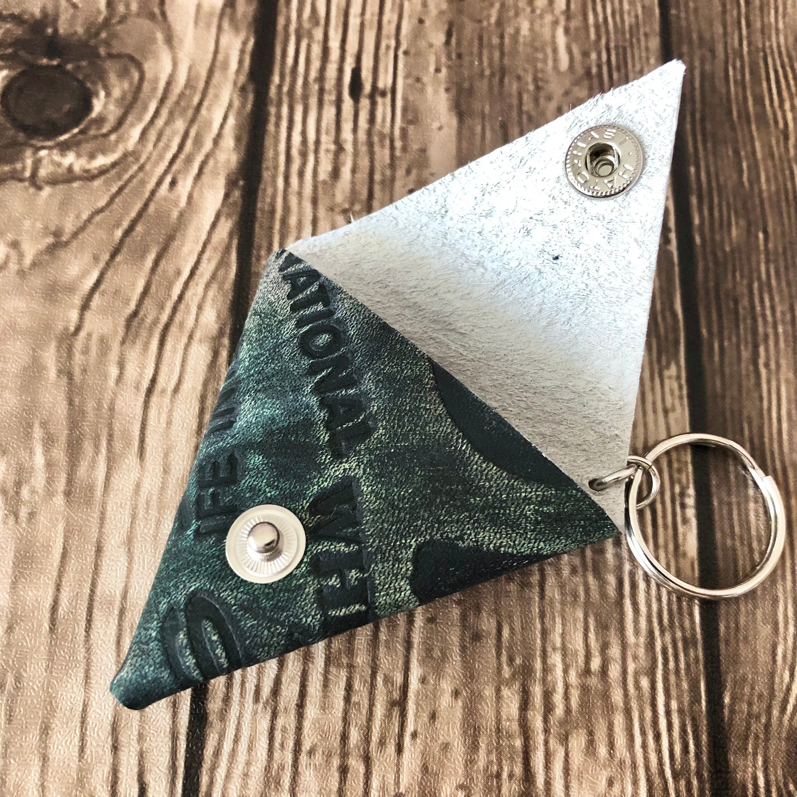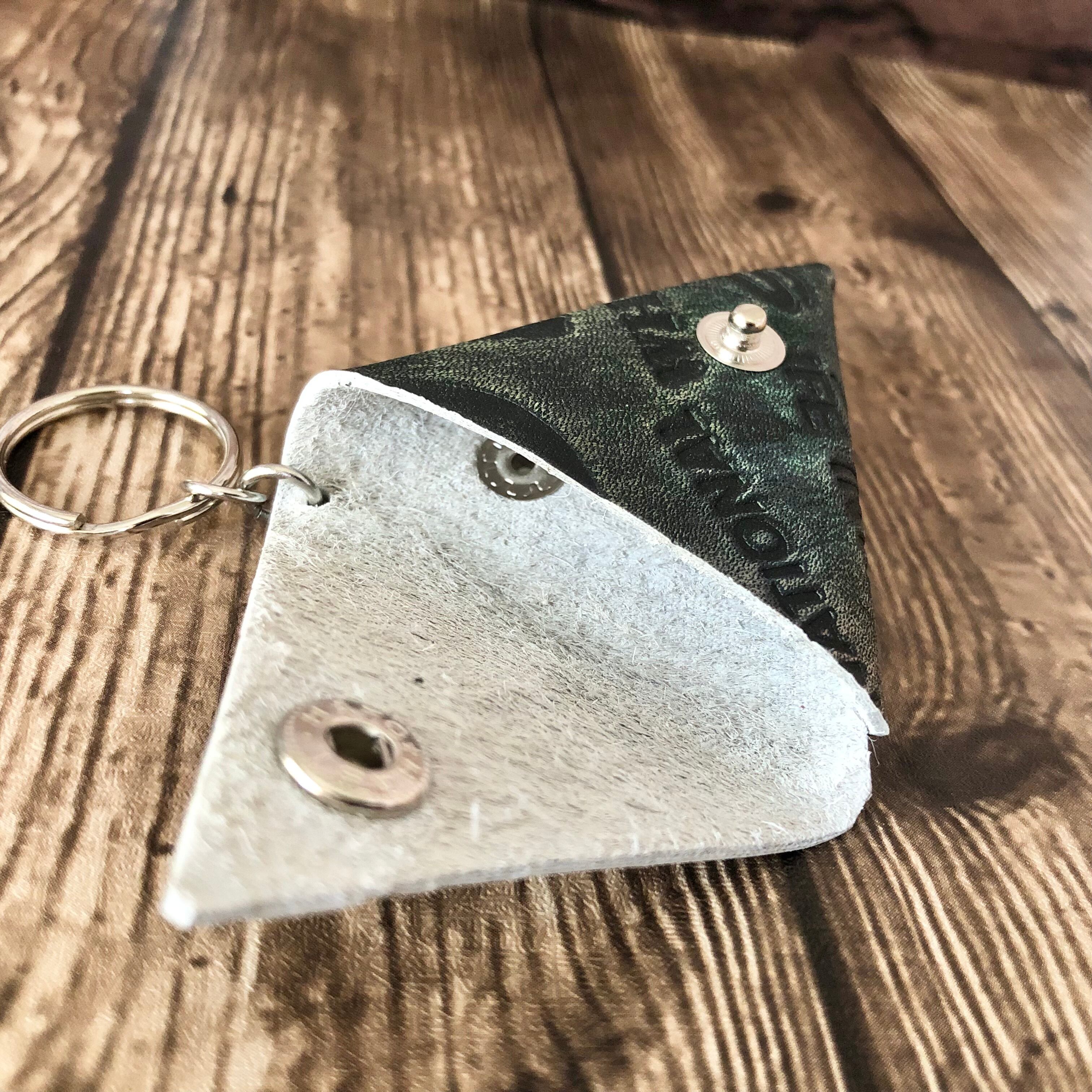 本革 三角マルチケース ミニサイズ/コインケース/キーホルダー/モスグリーン/英字型押し/レザークラフト/ハンドメイド【送料無料】[M-025KH]