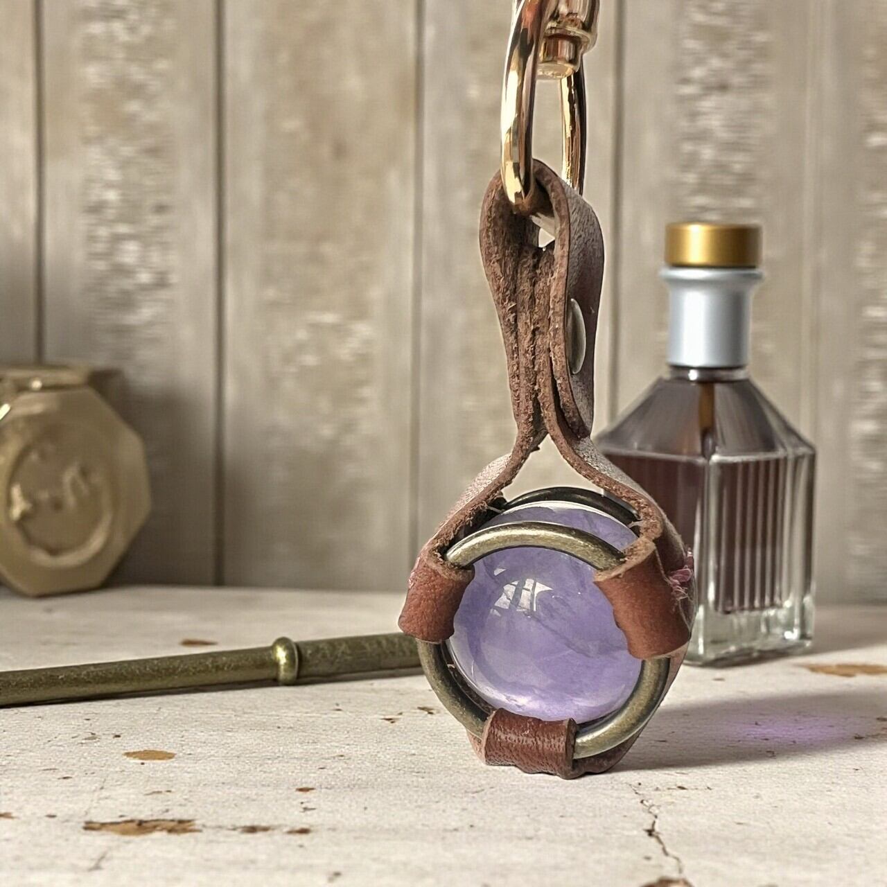 柔らかなラベンダーカラーが美しい、大粒のフローライトを贅沢に使用した本革キーホルダーです。