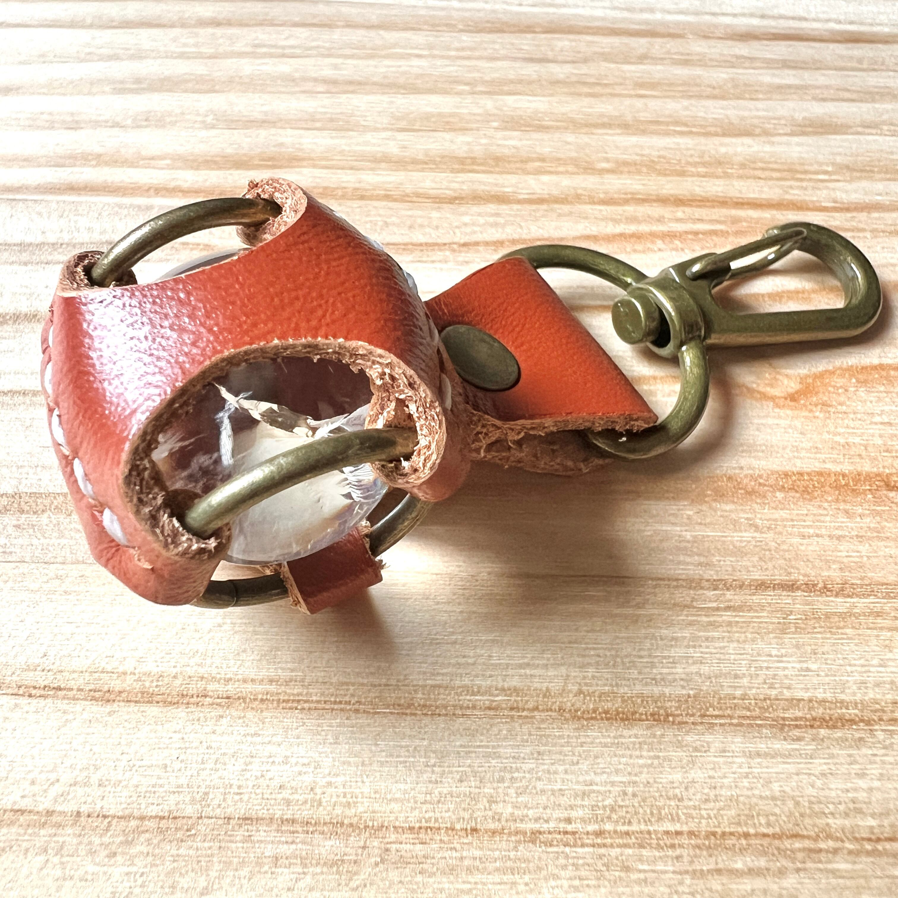 透明感のある虹入り水晶「アイリスクォーツ」を、本革で包み込み、持ち歩けるキーホルダーとして仕立てています。