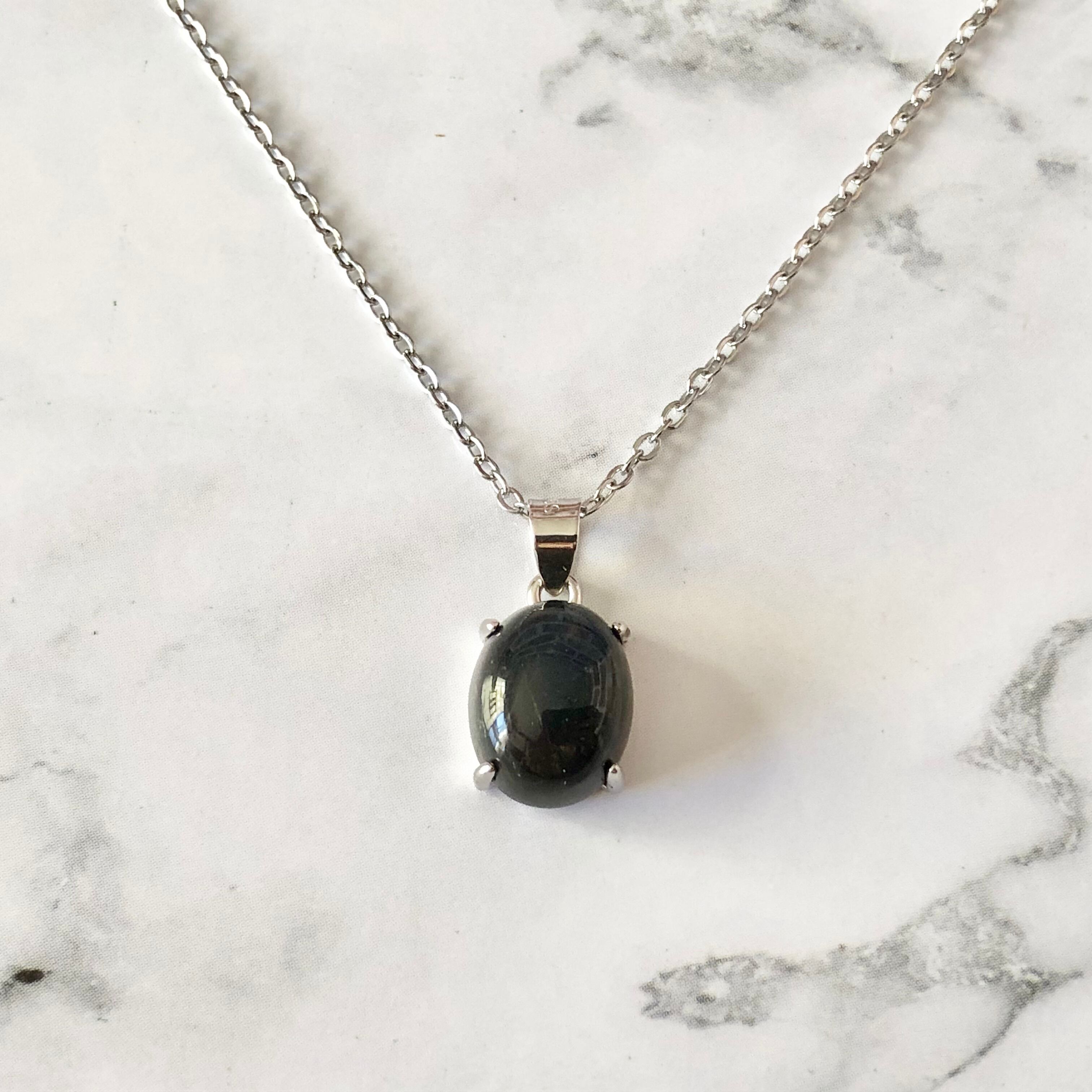 漆黒の中に秘められた青い光が幻想的に輝く、宝石質ブラックラブラドライトのカボションネックレスです。