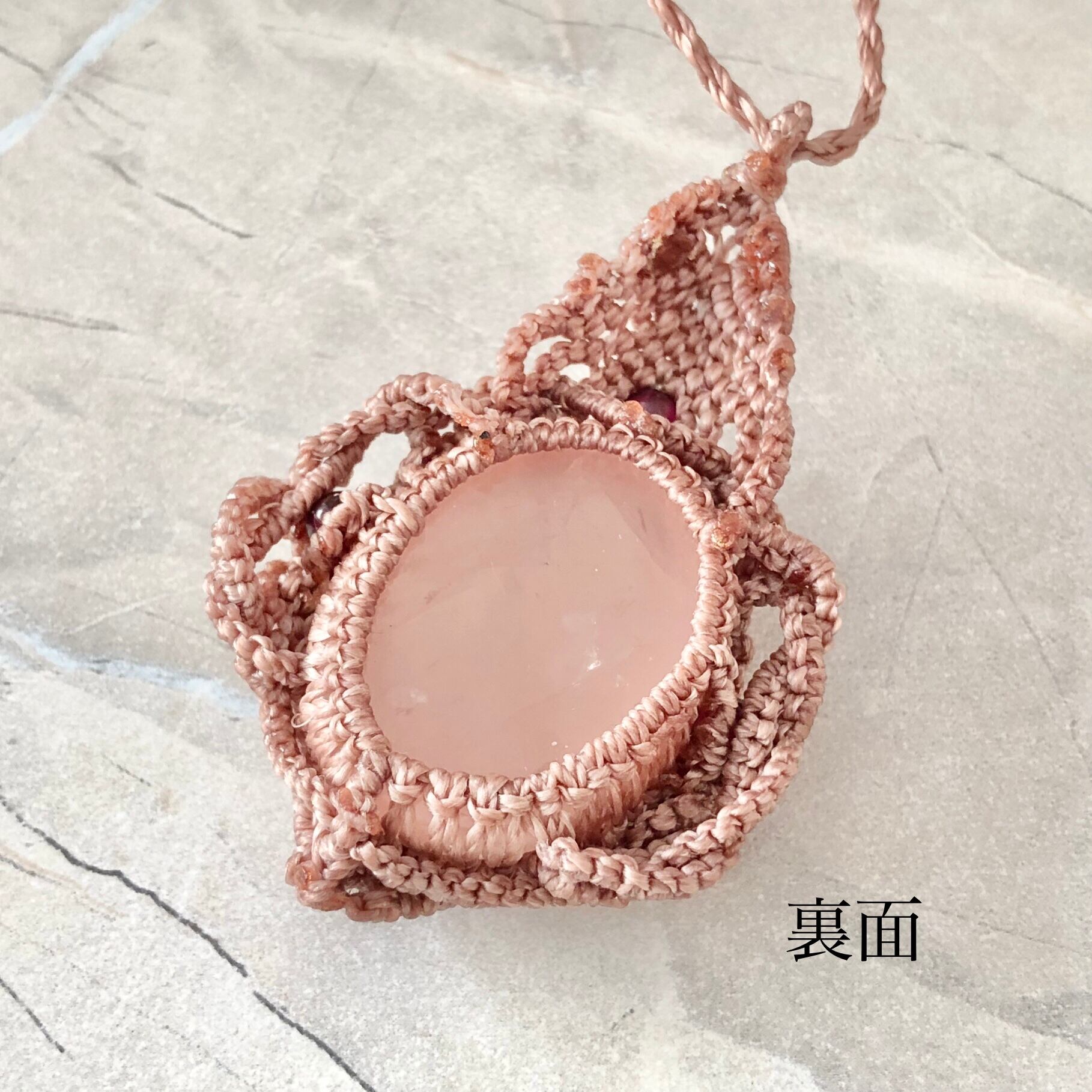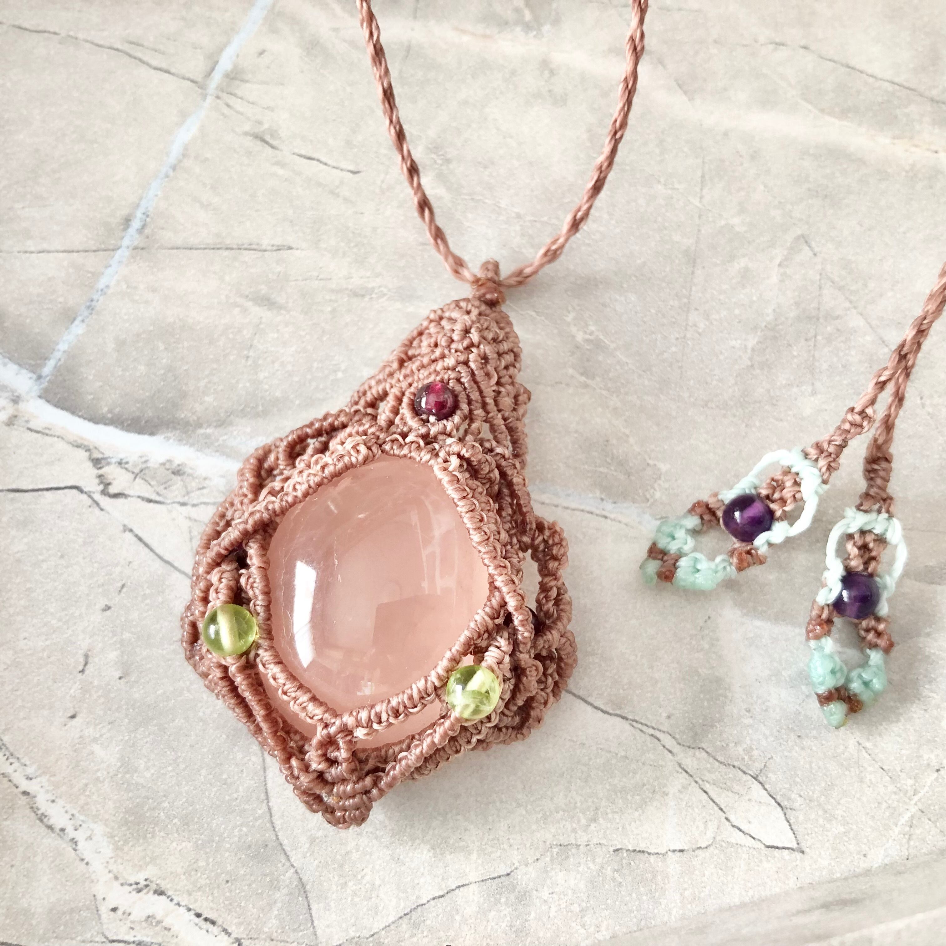 愛と癒しを象徴するローズクォーツをメインに、ガーネット、ペリドット、アメジストを組み合わせたデザインのマクラメ編みチョーカーです。