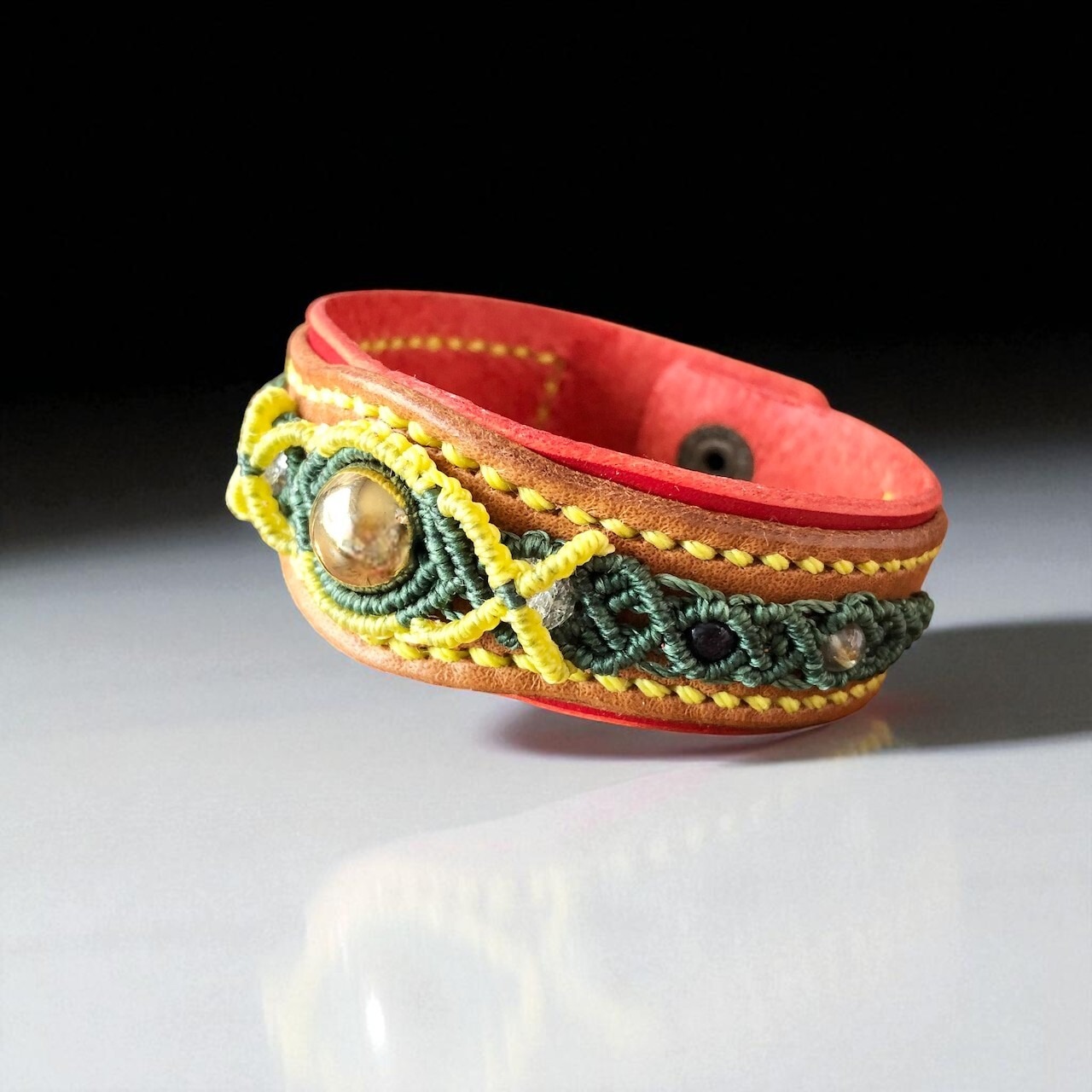 レザーは2枚を貼り合わせることで程よい厚みとボリューム感を演出。ナチュラルでありながらエスニックな雰囲気を持ち、手元を印象的に彩ります。
