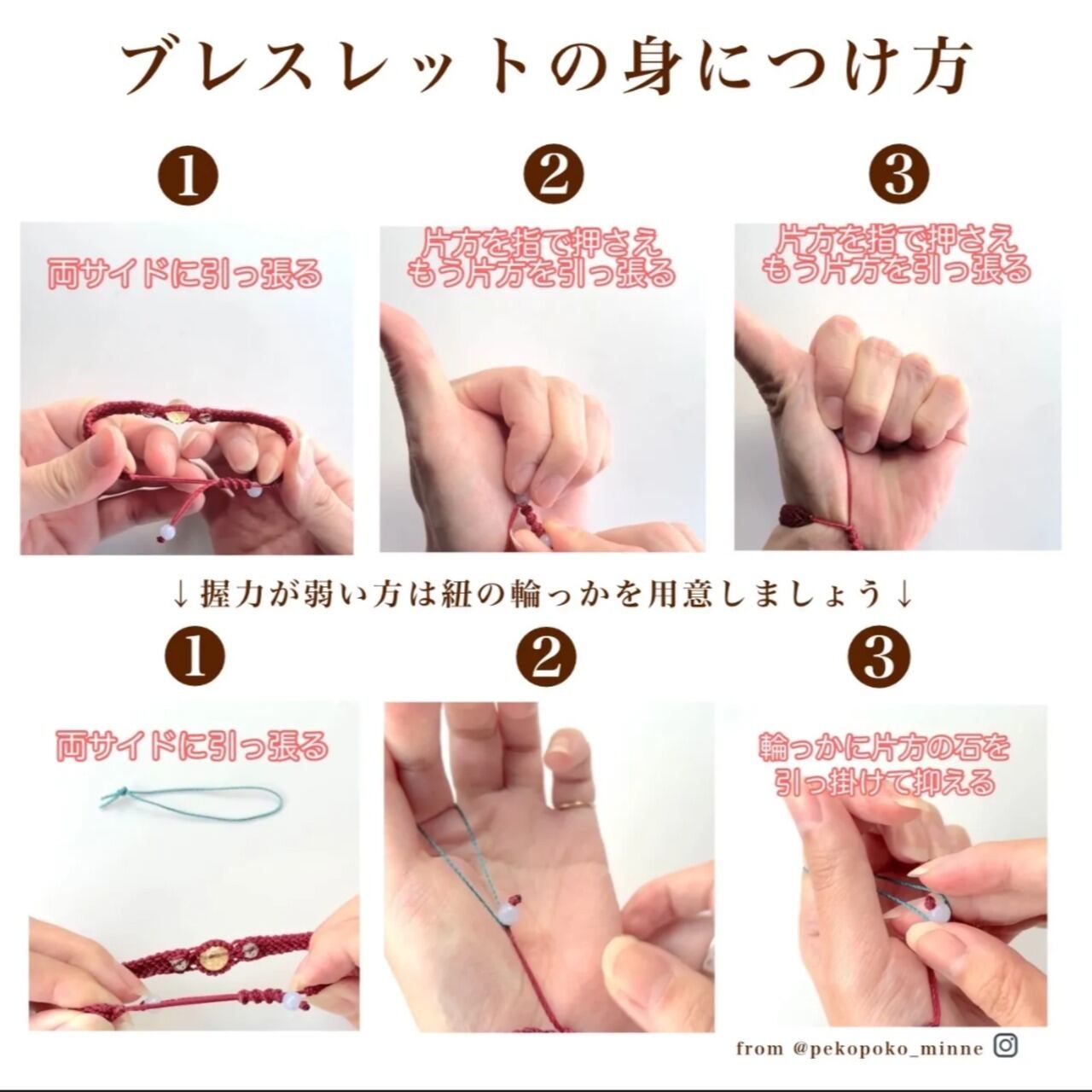 スライド式アジャスター(水晶付き)で約16〜23cmまで調整でき、手首に合わせてフィットします。