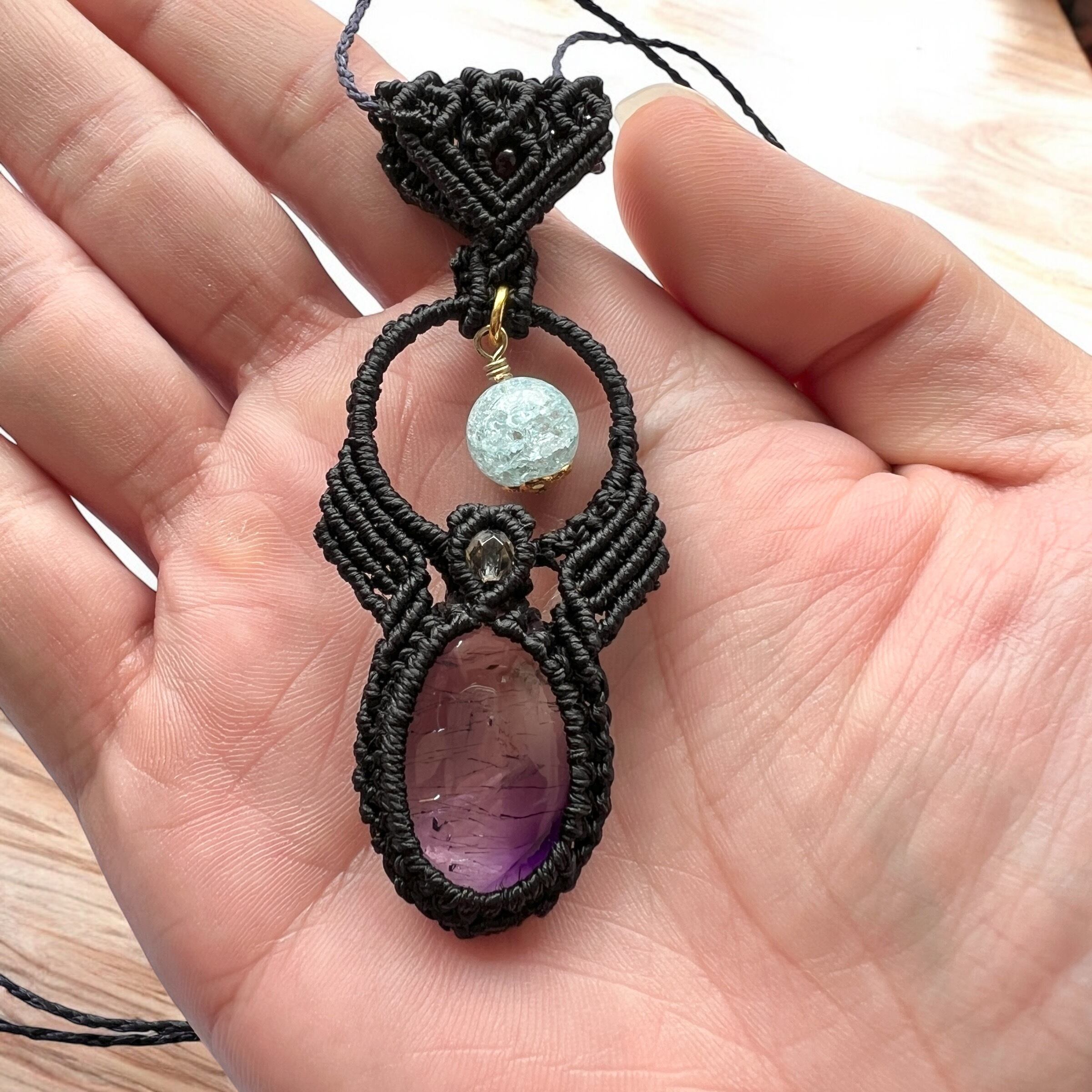 天使の贈り物:エレスチャルアメジストとクラッククォーツのマクラメ編みチョーカー【送料無料】[P-107N]