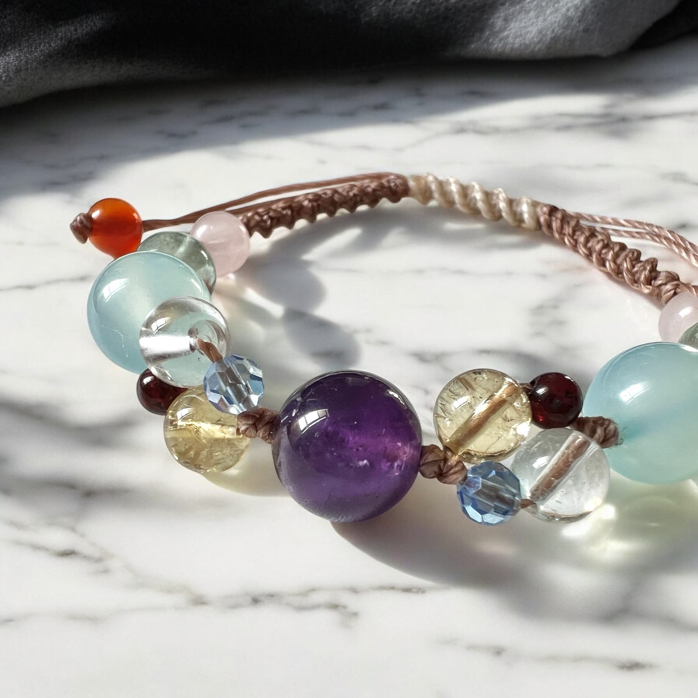 天然石を一つ一つ丁寧に編み込んだ、ナチュラルなデザインのブレスレットです。優しい色合いと透明感のある石たちが織りなすシンプルな美しさは、どんなスタイルにも自然に馴染みます。普段使いにはもちろん、大切な人へのギフトにもおすすめの一品です。