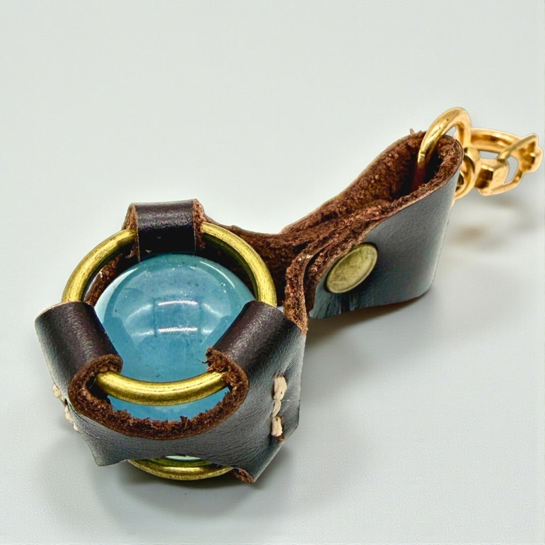 大粒アクアマリンを本革で包み、傷つきにくく持ち歩ける形に仕立てた一点ものキーホルダーです。