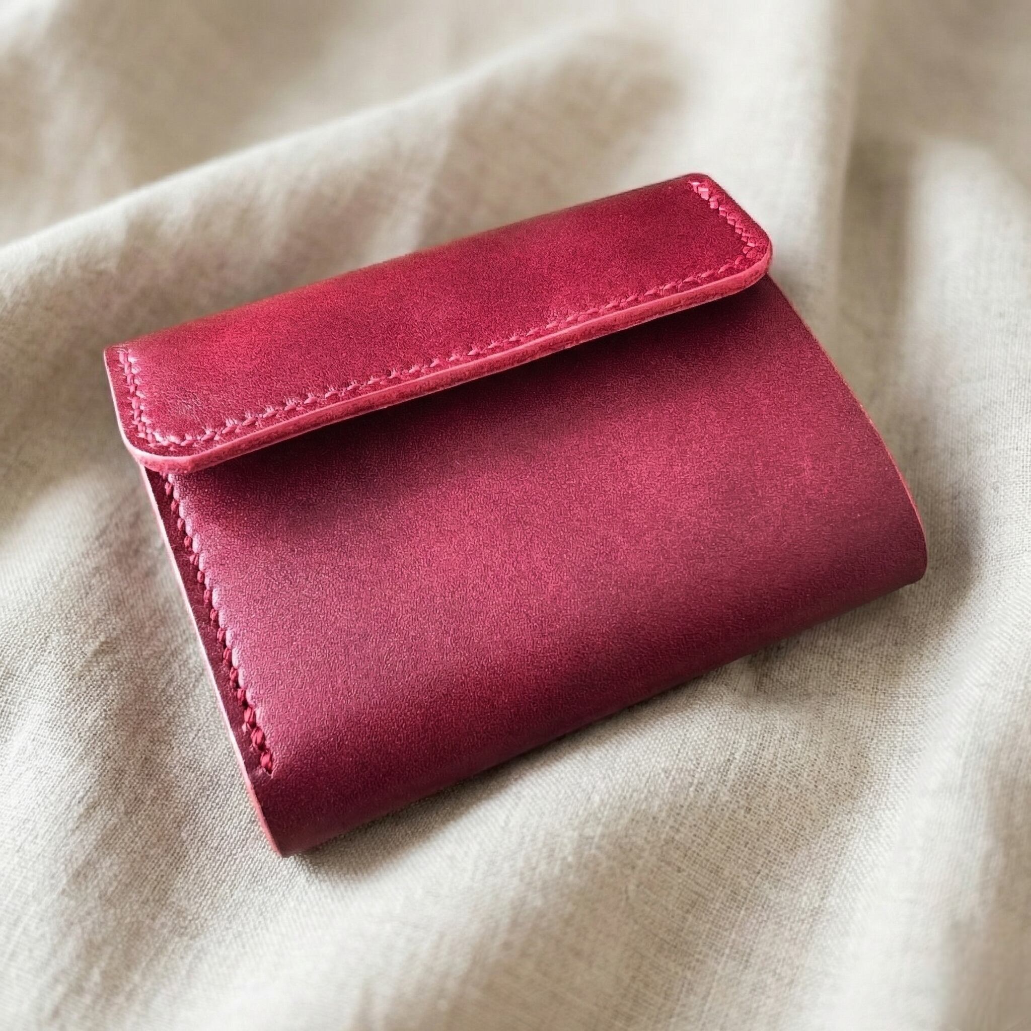 深みのあるワインレッドの本革を使用した、女性向けのコンパクトな三つ折り財布です。